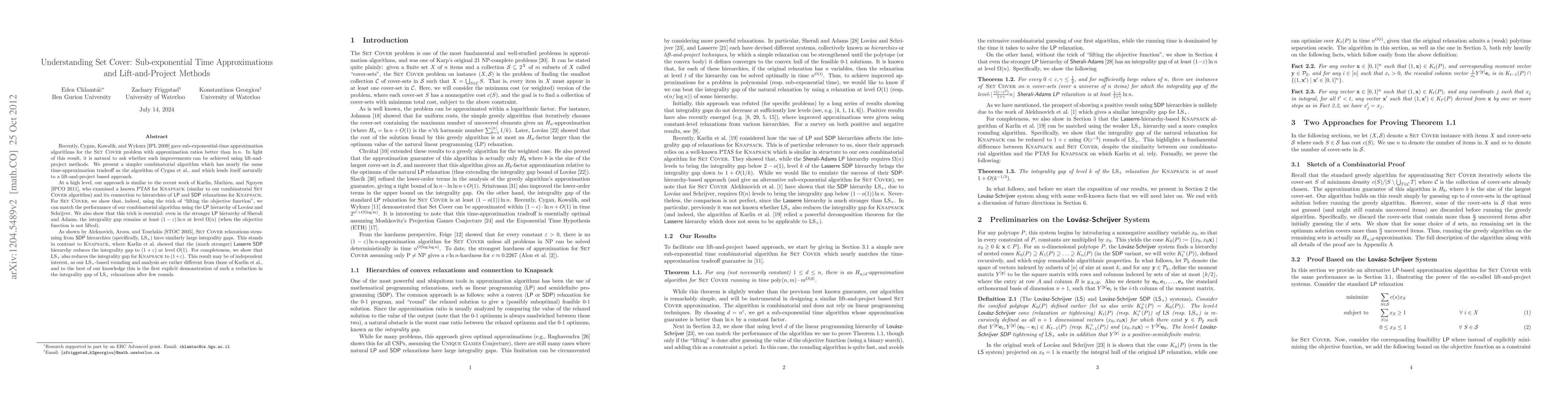 Researchers developed a simpler combinatorial algorithm for Set-Cover that achieves nearly the same time-approximation tradeoff as existing algorithms, and showed that lift-and-project methods can also achieve this performance using LP hierarchies.