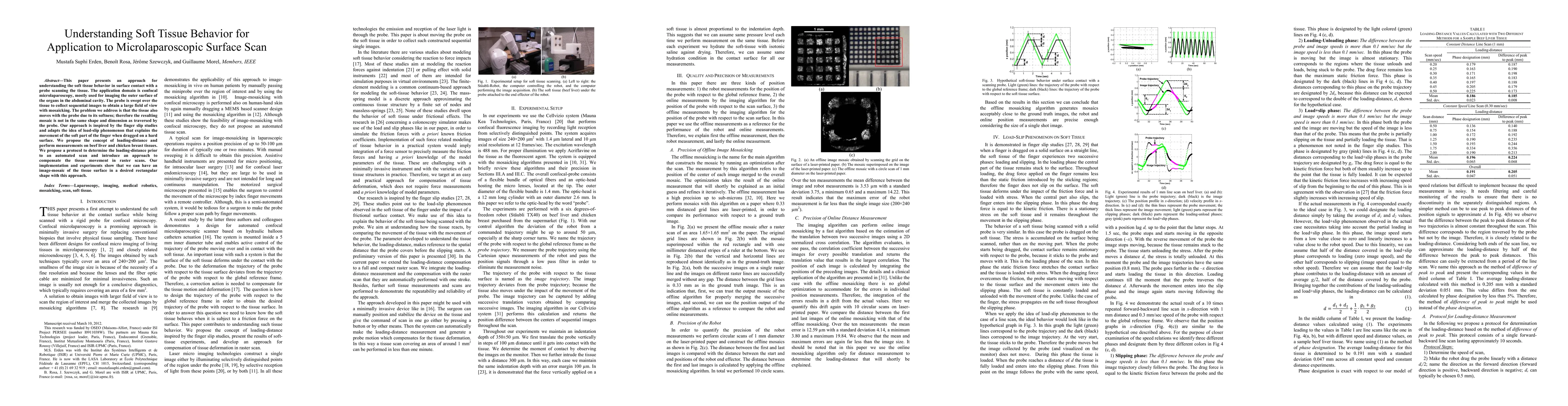 This paper introduces a method to understand soft tissue behavior during microlaparoscopic surface scanning, addressing the issue of tissue movement with the probe. Inspired by finger-slip studies, the approach uses 'loading-distance' concept, tested on beef liver and chicken breast tissues, to create a desired-shape tissue image-mosaic through compensation of tissue movement in raster scans.