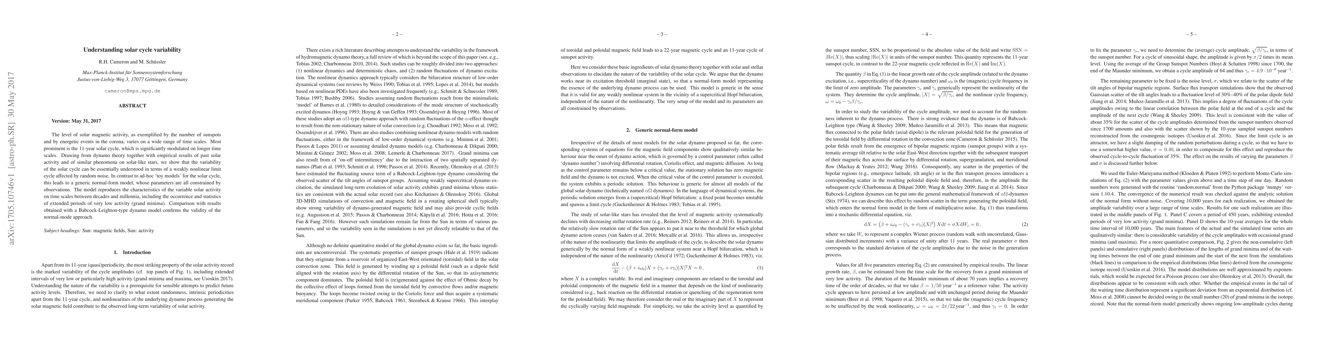 The level of solar magnetic activity, as exemplified by the number of sunspots and by energetic events in the corona, varies on a wide range of time scales. Most prominent is the 11-year solar cycle, which is significantly modulated on longer time scales. Drawing from dynamo theory together with empirical results of past solar activity and of similar phenomena on solar-like stars, we show that the variability of the solar cycle can be essentially understood in terms of a weakly nonlinear limit cycle affected by random noise. In contrast to ad-hoc `toy models' for the solar cycle, this leads to a generic normal-form model, whose parameters are all constrained by observations. The model reproduces the characteristics of the variable solar activity on time scales between decades and millennia, including the occurrence and statistics of extended periods of very low activity (grand minima). Comparison with results obtained with a Babcock-Leighton-type dynamo model confirms the validity of the normal-mode approach.