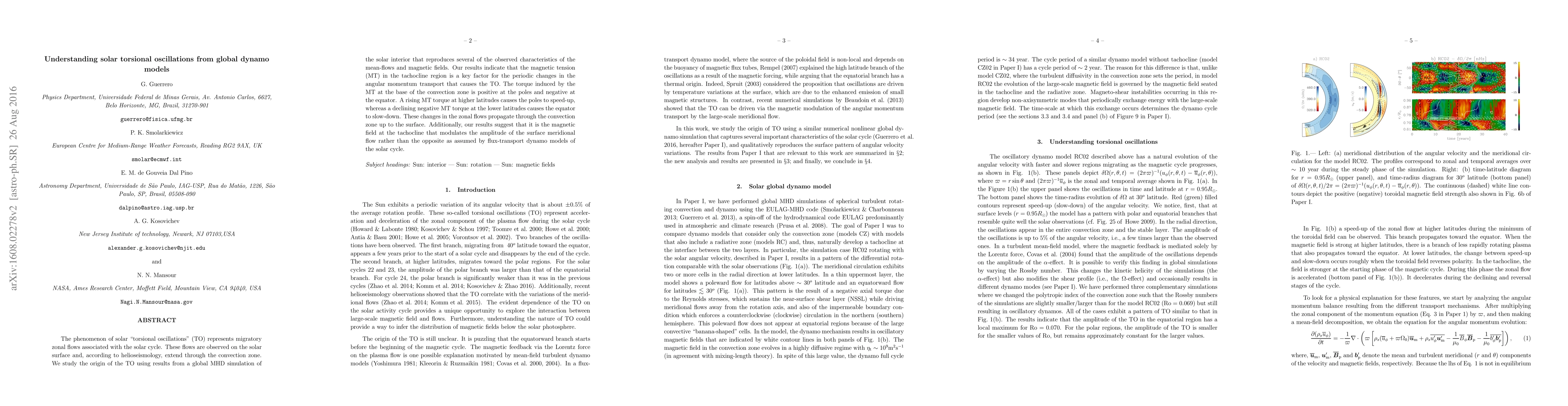 This paper investigates the origin of solar torsional oscillations using global MHD simulations, finding that magnetic tension in the tachocline region drives the periodic changes in angular momentum transport. The magnetic field modulates the meridional flow amplitude, contrary to flux-transport dynamo models.