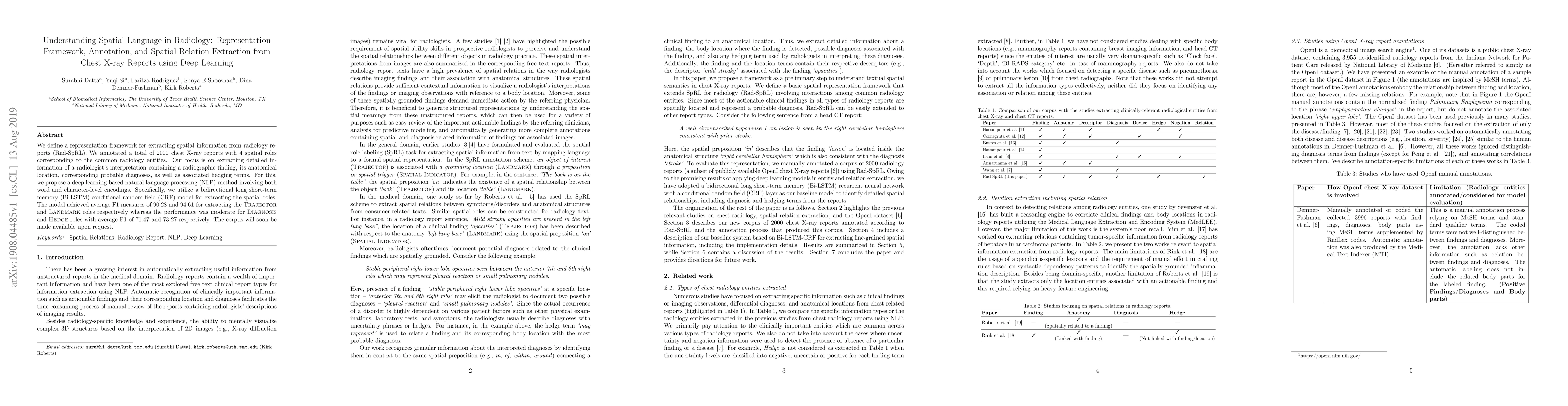 We define a representation framework for extracting spatial information from radiology reports (Rad-SpRL). We annotated a total of 2000 chest X-ray reports with 4 spatial roles corresponding to the common radiology entities. Our focus is on extracting detailed information of a radiologist's interpretation containing a radiographic finding, its anatomical location, corresponding probable diagnoses, as well as associated hedging terms. For this, we propose a deep learning-based natural language processing (NLP) method involving both word and character-level encodings. Specifically, we utilize a bidirectional long short-term memory (Bi-LSTM) conditional random field (CRF) model for extracting the spatial roles. The model achieved average F1 measures of 90.28 and 94.61 for extracting the Trajector and Landmark roles respectively whereas the performance was moderate for Diagnosis and Hedge roles with average F1 of 71.47 and 73.27 respectively. The corpus will soon be made available upon request.