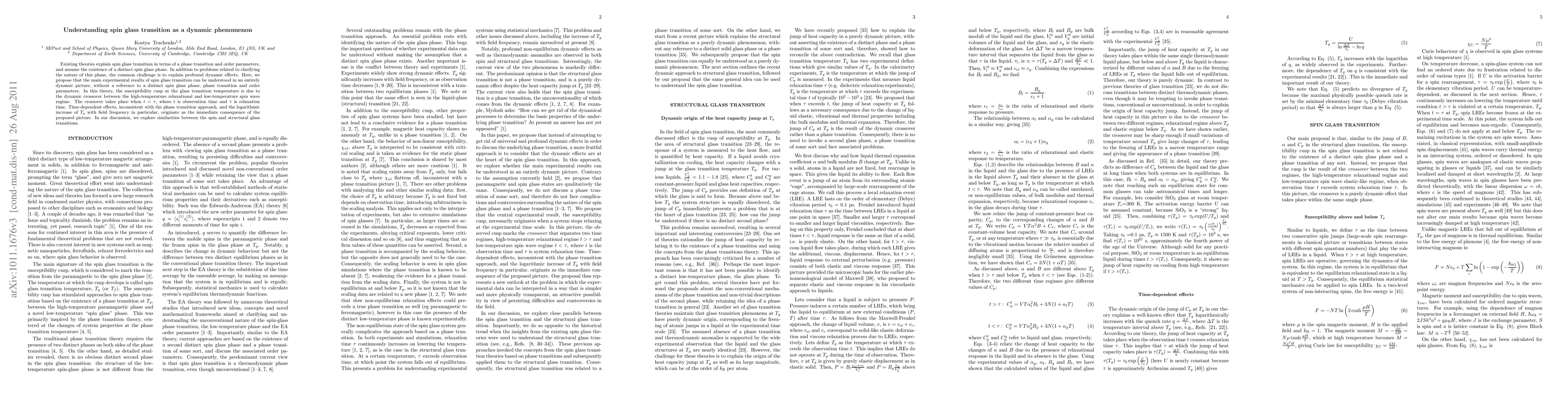 Existing theories explain spin glass transition in terms of a phase transition and order parameters, and assume the existence of a distinct spin glass phase. In addition to problems related to clarifying the nature of this phase, the common challenge is to explain profound dynamic effects. Here, we propose that the main experimental results of spin glass transition can be understood in an entirely dynamic picture, without a reference to a distinct spin glass phase, phase transition and order parameters. In this theory, the susceptibility cusp at the glass transition temperature is due to the dynamic crossover between the high-temperature relaxational and low-temperature spin wave, or elastic, regime. The crossover takes place when $t=\tau$, where $t$ is observation time and $\tau$ is relaxation time. Time-dependent effects, inconsistent with the phase transition approach, and the logarithmic increase of $T_g$ with field frequency in particular, originate as the immediate consequence of the proposed picture. We comment on the behavior of non-linear susceptibility. In our discussion, we explore similarities between the spin and structural glass transitions.