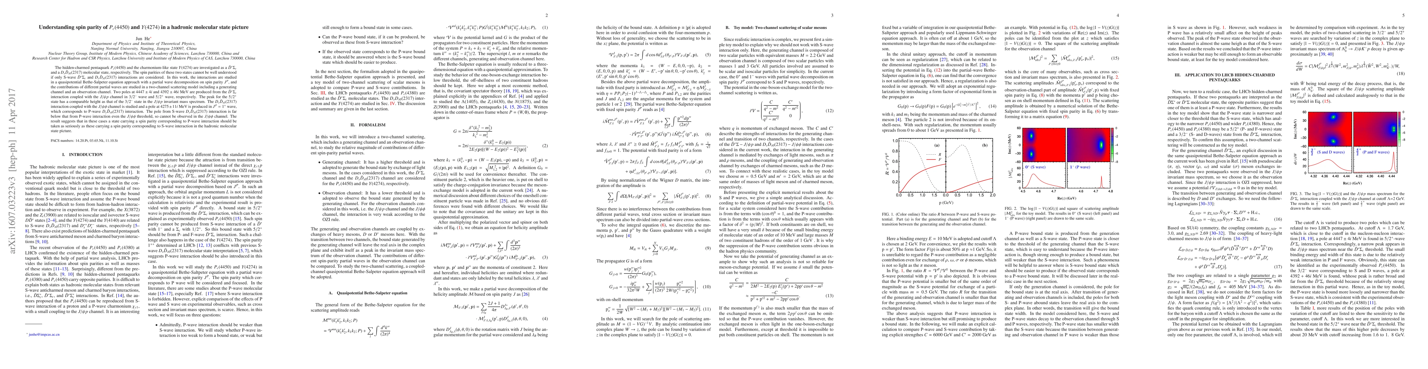 This study investigates the hidden-charmed pentaquark P_c(4450) and charmonium-like state Y(4274) as molecular states. Utilizing a quasipotential Bethe-Salpeter equation approach, the research finds that both states' spin parities require consideration of higher partial waves beyond S-wave. The P_c(4450) exhibits poles in 3/2- and 5/2+ waves in its J/psi p channel, while Y(4274) shows a pole in 1+ wave in its J/psi phi channel. This suggests that P-wave interactions should be considered as important as S-wave interactions in the hadronic molecular state picture.