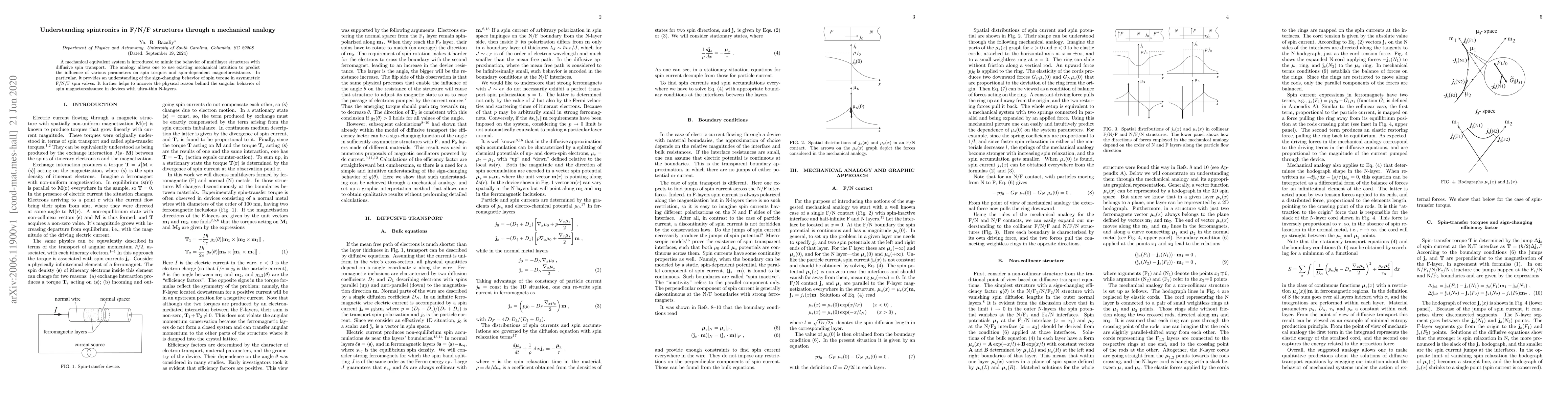 A mechanical equivalent system is introduced to mimic the behavior of multilayer structures with diffusive spin transport. The analogy allows one to use existing mechanical intuition to predict the influence of various parameters on spin torques and spin-dependent magnetoresistance. In particular, it provides an understanding of the sign-changing behavior of spin torque in asymmetric F/N/F spin valves. It further helps to uncover the physical reason behind the singular behavior of spin magnetoresistance in devices with ultra-thin N-layers.