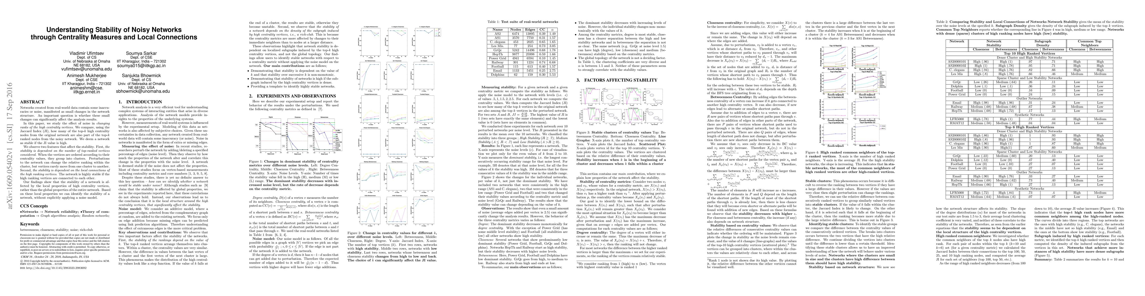 Networks created from real-world data contain some inaccuracies or noise, manifested as small changes in the network structure. An important question is whether these small changes can significantly affect the analysis results. In this paper, we study the effect of noise in changing ranks of the high centrality vertices. We compare, using the Jaccard Index (JI), how many of the top-k high centrality nodes from the original network are also part of the top-k ranked nodes from the noisy network. We deem a network as stable if the JI value is high. We observe two features that affect the stability. First, the stability is dependent on the number of top-ranked vertices considered. When the vertices are ordered according to their centrality values, they group into clusters. Perturbations to the network can change the relative ranking within the cluster, but vertices rarely move from one cluster to another. Second, the stability is dependent on the local connections of the high ranking vertices. The network is highly stable if the high ranking vertices are connected to each other. Our findings show that the stability of a network is affected by the local properties of high centrality vertices, rather than the global properties of the entire network. Based on these local properties we can identify the stability of a network, without explicitly applying a noise model.