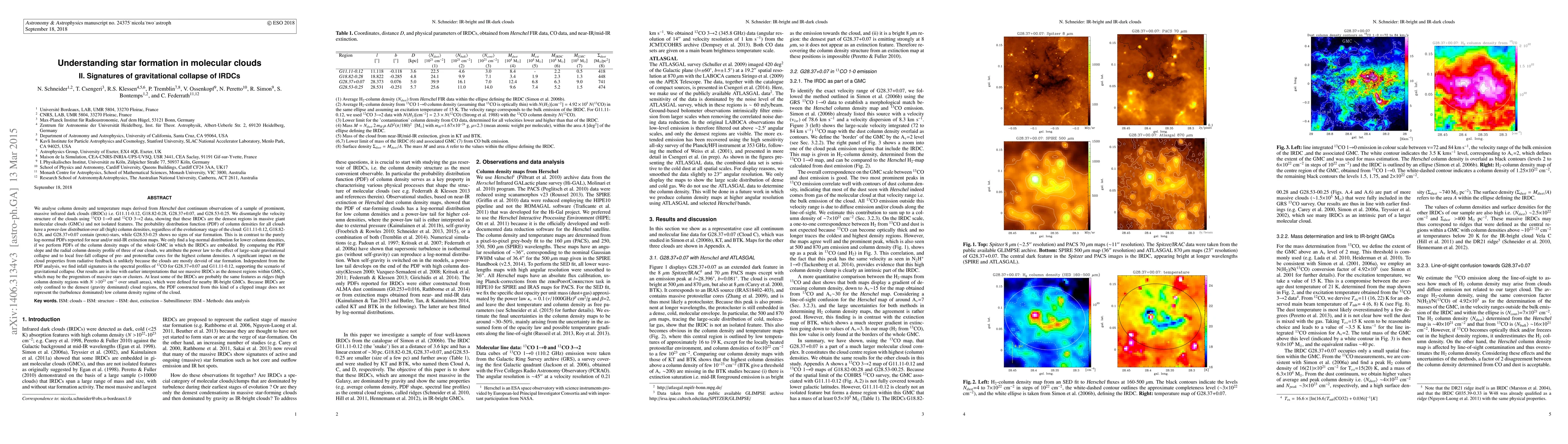 We analyse column density and temperature maps derived from Herschel dust continuum observations of a sample of massive infrared dark clouds (G11.11-0.12, G18.82-0.28, G28.37+0.07, G28.53-0.25). We disentangle the velocity structure of the clouds using 13CO 1-0 and 12CO 3-2 data, showing that these IRDCs are the densest regions in massive giant molecular clouds and not isolated features. The probability distribution function (PDF) of column densities for all clouds have a power-law distribution over all (high) column densities, regardless of the evolutionary stage of the cloud: G11.11-0.12, G18.82-0.28, and G28.37+0.07 contain (proto)-stars, while G28.53-0.25 shows no signs of star formation. This is in contrast to the purely log-normal PDFs reported for near/mid-IR extinction maps. We only find a log-normal distribution for lower column densities, if we perform PDFs of the column density maps of the whole GMC in which the IRDCs are embedded. By comparing the PDF slope and the radial column density profile, we attribute the power law to the effect of large-scale gravitational collapse and to local free-fall collapse of pre- and protostellar cores. Independent from the PDF analysis, we find infall signatures in the spectral profiles of 12CO for G28.37+0.07 and G11.11-0.12, supporting the scenario of gravitational collapse. IRDCs are the densest regions within GMCs, which may be the progenitors of massive stars or clusters. At least some of the IRDCs are probably the same features as ridges (high column density regions with N>1e23 cm-2 over small areas), which were defined for nearby IR-bright GMCs. Because IRDCs are only confined to the densest (gravity dominated) cloud regions, the PDF constructed from this kind of a clipped image does not represent the (turbulence dominated) low column density regime of the cloud.
