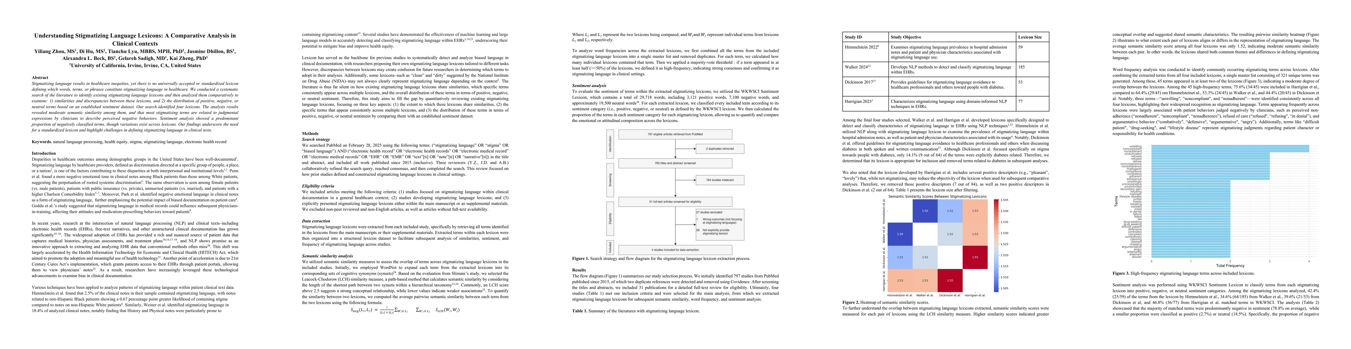 Stigmatizing language results in healthcare inequities, yet there is no universally accepted or standardized lexicon defining which words, terms, or phrases constitute stigmatizing language in healthcare. We conducted a systematic search of the literature to identify existing stigmatizing language lexicons and then analyzed them comparatively to examine: 1) similarities and discrepancies between these lexicons, and 2) the distribution of positive, negative, or neutral terms based on an established sentiment dataset. Our search identified four lexicons. The analysis results revealed moderate semantic similarity among them, and that most stigmatizing terms are related to judgmental expressions by clinicians to describe perceived negative behaviors. Sentiment analysis showed a predominant proportion of negatively classified terms, though variations exist across lexicons. Our findings underscore the need for a standardized lexicon and highlight challenges in defining stigmatizing language in clinical texts.
