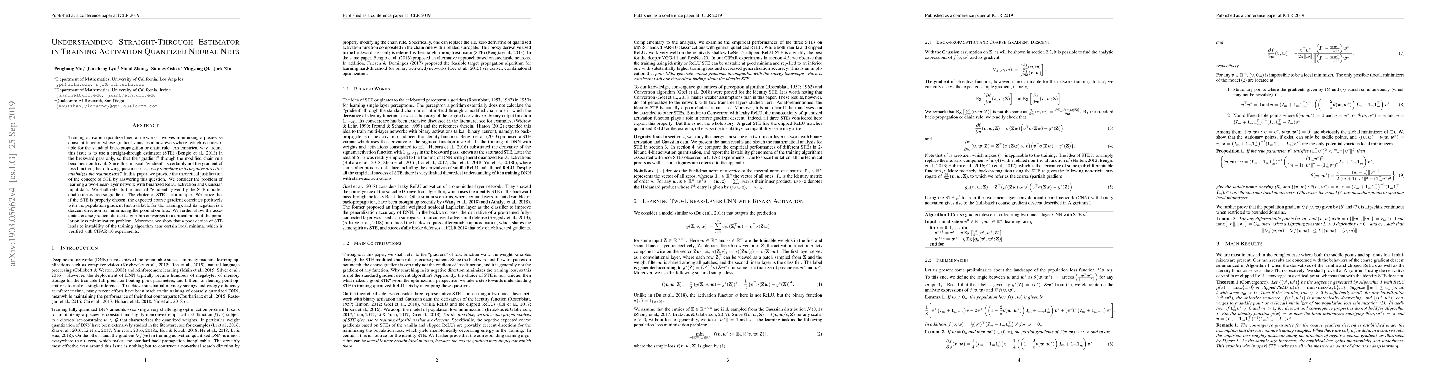 This paper provides a theoretical justification for the straight-through estimator (STE) used in training quantized neural networks, showing that a properly chosen STE correlates positively with the population gradient and its negation is a descent direction for minimizing training loss. It also demonstrates that poor STE choices lead to training instability, verified through CIFAR-10 experiments.
