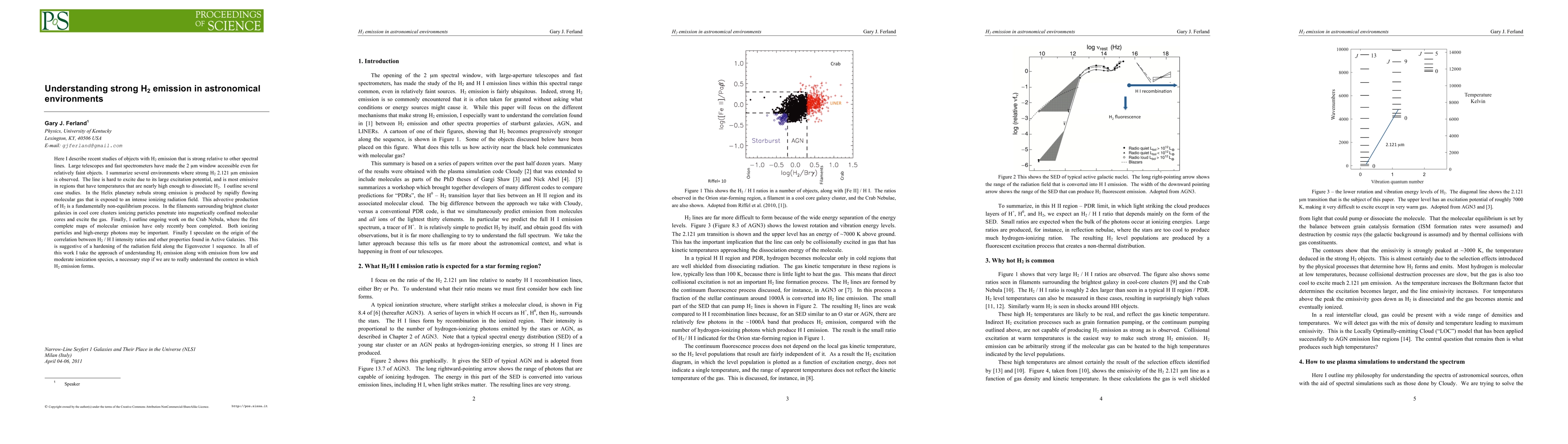 This paper reviews recent studies on strong molecular hydrogen emission in various astronomical environments, emphasizing the 2 μm spectral window. It highlights case studies in the Helix planetary nebula, filaments around brightest cluster galaxies, and the Crab Nebula, noting the non-equilibrium processes and high-energy excitations that drive this emission. The paper also speculates on correlations between H2/HI intensity ratios and properties in Active Galaxies.