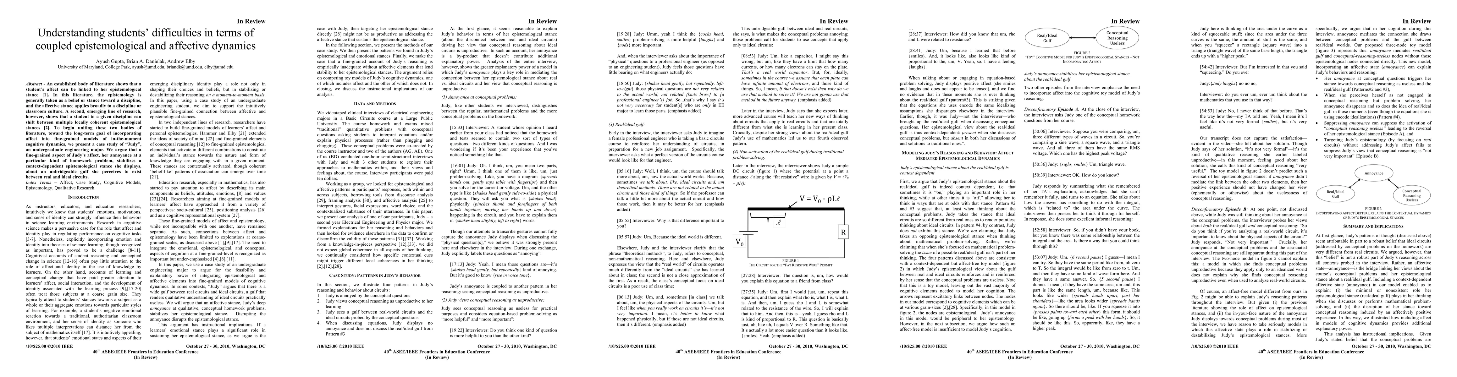 This paper explores the interplay between students' epistemological beliefs and their affective states, using a case study of an engineering student named Judy. It argues that Judy's annoyance with certain homework problems stabilizes a context-dependent epistemological stance she holds regarding the gap between real and ideal circuits.