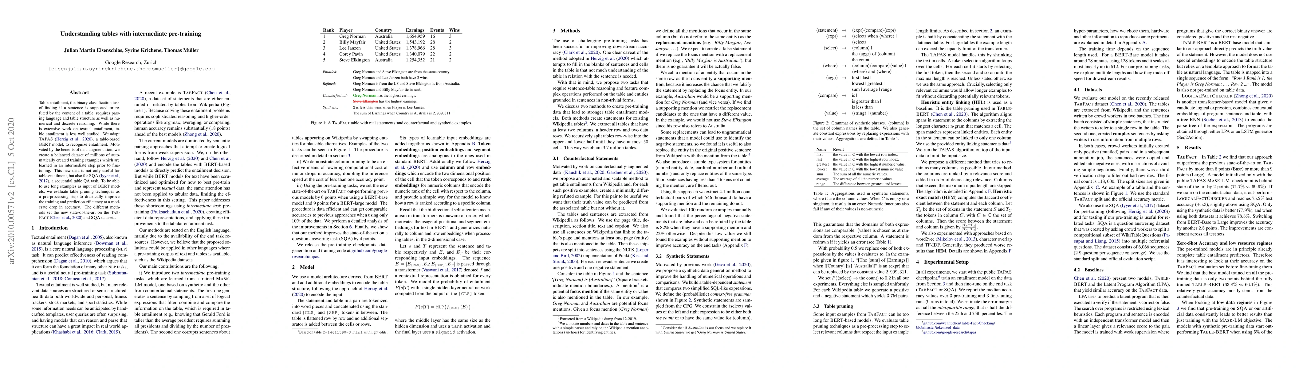 Table entailment, the binary classification task of finding if a sentence is supported or refuted by the content of a table, requires parsing language and table structure as well as numerical and discrete reasoning. While there is extensive work on textual entailment, table entailment is less well studied. We adapt TAPAS (Herzig et al., 2020), a table-based BERT model, to recognize entailment. Motivated by the benefits of data augmentation, we create a balanced dataset of millions of automatically created training examples which are learned in an intermediate step prior to fine-tuning. This new data is not only useful for table entailment, but also for SQA (Iyyer et al., 2017), a sequential table QA task. To be able to use long examples as input of BERT models, we evaluate table pruning techniques as a pre-processing step to drastically improve the training and prediction efficiency at a moderate drop in accuracy. The different methods set the new state-of-the-art on the TabFact (Chen et al., 2020) and SQA datasets.