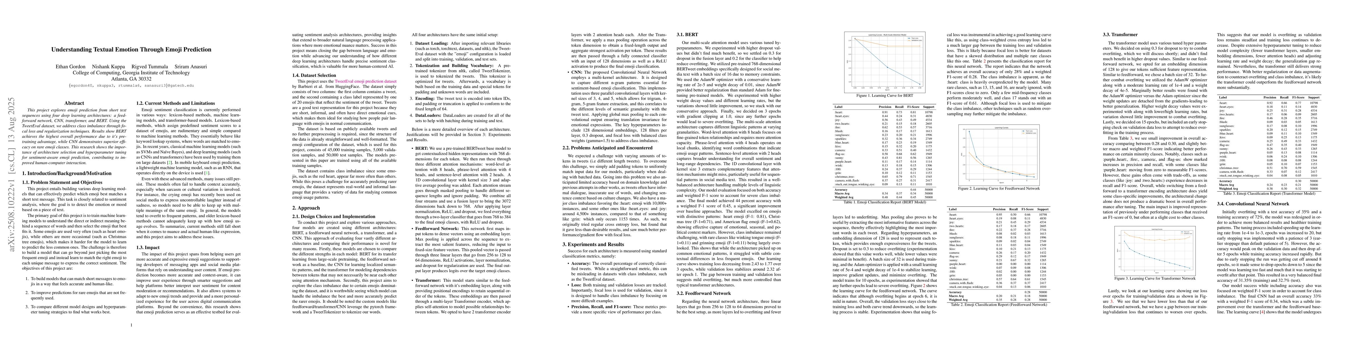 This project explores emoji prediction from short text sequences using four deep learning architectures: a feed-forward network, CNN, transformer, and BERT. Using the TweetEval dataset, we address class imbalance through focal loss and regularization techniques. Results show BERT achieves the highest overall performance due to its pre-training advantage, while CNN demonstrates superior efficacy on rare emoji classes. This research shows the importance of architecture selection and hyperparameter tuning for sentiment-aware emoji prediction, contributing to improved human-computer interaction.