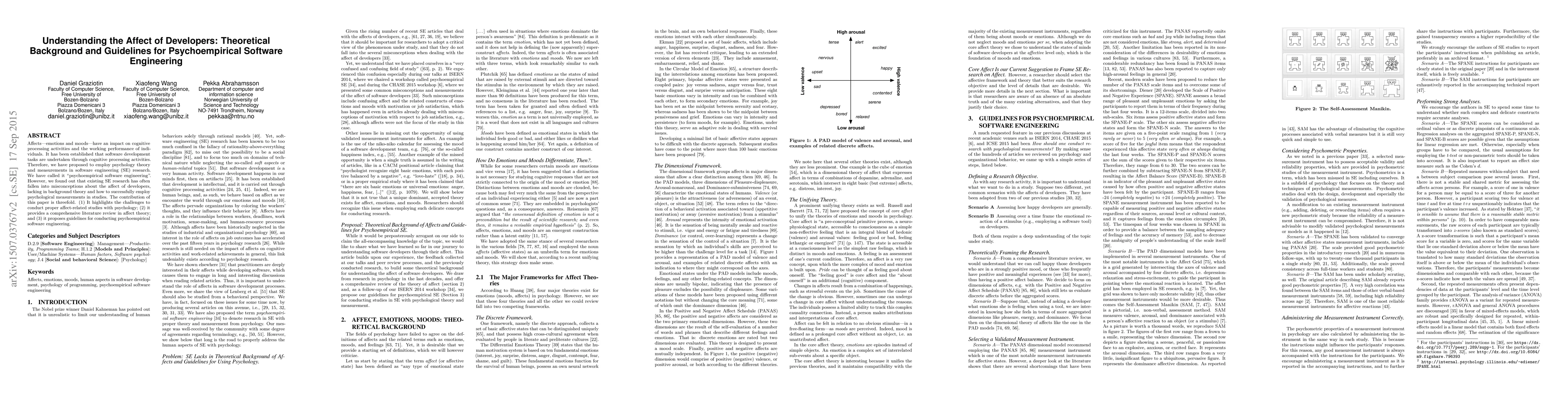 Affects---emotions and moods---have an impact on cognitive processing activities and the working performance of individuals. It has been established that software development tasks are undertaken through cognitive processing activities. Therefore, we have proposed to employ psychology theory and measurements in software engineering (SE) research. We have called it "psychoempirical software engineering". However, we found out that existing SE research has often fallen into misconceptions about the affect of developers, lacking in background theory and how to successfully employ psychological measurements in studies. The contribution of this paper is threefold. (1) It highlights the challenges to conduct proper affect-related studies with psychology; (2) it provides a comprehensive literature review in affect theory; and (3) it proposes guidelines for conducting psychoempirical software engineering.