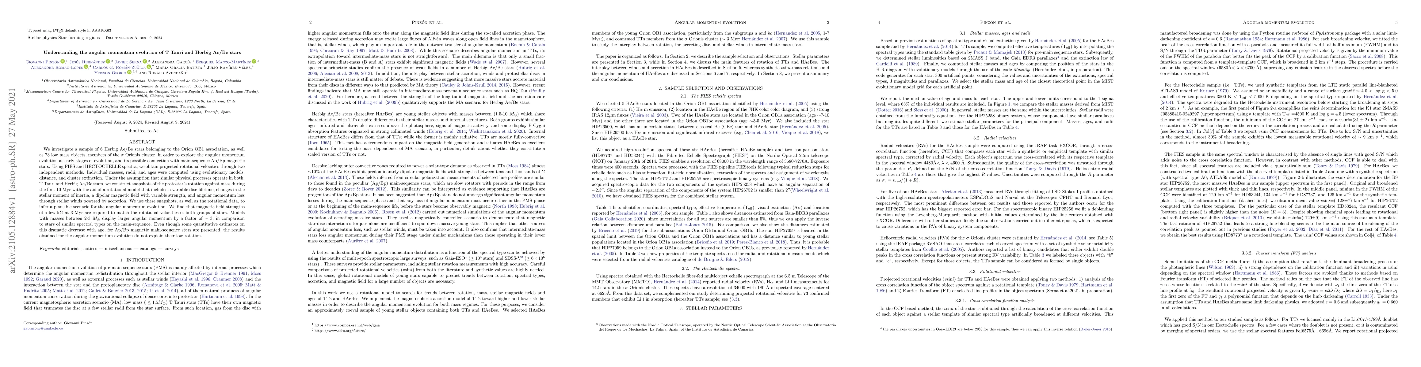 We investigate a sample of 6 Herbig Ae/Be stars belonging to the Orion OB1 association, as well as 73 low mass objects, members of the $\sigma$ Orionis cluster, in order to explore the angular momentum evolution at early stages of evolution, and its possible connection with main-sequence Ap/Bp magnetic stars. Using FIES and HECTOCHELLE spectra, we obtain projected rotational velocities through two independent methods. Individual masses, radii, and ages were computed using evolutionary models, distance, and cluster extinction. Under the assumption that similar physical processes operate in both, T Tauri and Herbig Ae/Be stars, we construct snapshots of the protostar's rotation against mass during the first 10 Myr with the aid of a rotational model that includes a variable disc lifetime, changes in the stellar moment of inertia, a dipolar magnetic field with variable strength, and angular momentum loss through stellar winds powered by accretion. We use these snapshots, as well as the rotational data, to infer a plausible scenario for the angular momentum evolution. We find that magnetic field strengths of a few k$G$ at 3 Myr are required to match the rotational velocities of both groups of stars. Models with masses between 2-3 $M_{\odot}$ display larger angular momentum by a factor of $\sim 3$, in comparison to stars of similar spectral types on the main-sequence. Even though some quantitative estimates on this dramatic decrease with age, for Ap/Bp magnetic main-sequence stars are presented, the results obtained for the angular momentum evolution do not explain their low rotation.
