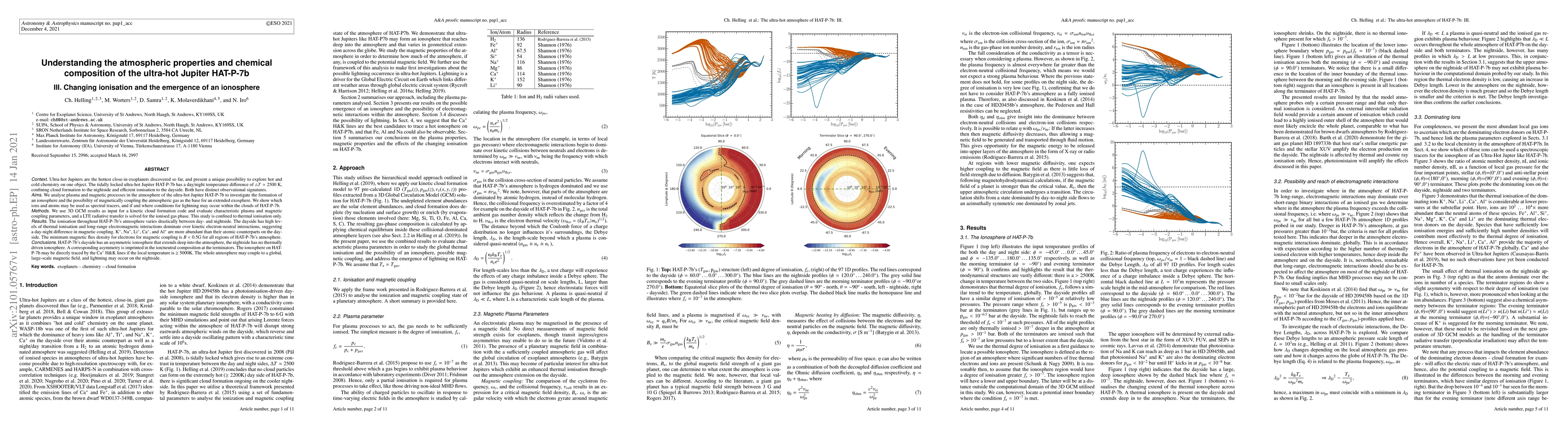 Ultra-hot Jupiters are the hottest close-in exoplanets discovered so far, and present a unique possibility to explore hot and cold chemistry on one object. The tidally locked ultra-hot Jupiter HAT-P-7b has a day/night temperature difference of ~ 2500K, confining cloud formation to the nightside and efficient ionisation to the dayside. Both have distinct observational signatures. We analyse plasma and magnetic processes in the atmosphere of the ultra-hot Jupiter HAT-P-7b to investigate the formation of a thermal ionosphere and the possibility of magnetically coupling the atmospheric gas as the base for an extended exosphere. We show which ions and atoms may be used as spectral tracers, and if and where conditions for lightning may occur within the clouds of HAT-P-7b, evaluate characteristic plasma and magnetic coupling parameters, and a LTE radiative transfer is solved for the ionised gas phase. The ionisation throughout HAT-P-7b's atmosphere varies drastically between day- and nightside. The dayside has high levels of thermal ionisation and long-range electromagnetic interactions dominate over kinetic electron-neutral interactions, suggesting a day-night difference in magnetic coupling. K+, Na+, Li+, Ca+, and Al+ are more abundant than their atomic counterparts on the dayside. The minimum magnetic flux density for electrons for magnetic coupling is B<0.5G for all regions of HAT-P-7b's atmosphere. HAT-P-7b's dayside has an asymmetric ionosphere that extends deep into the atmosphere, the nightside has no thermally driven ionosphere. A corresponding asymmetry is imprinted in the ion/neutral composition at the terminators. The ionosphere on HAT-P-7b may be directly traced by the Ca+ H&K lines if the local temperature is > 5000K. The whole atmosphere may couple to a global, large-scale magnetic field, and lightning may occur on the nightside.