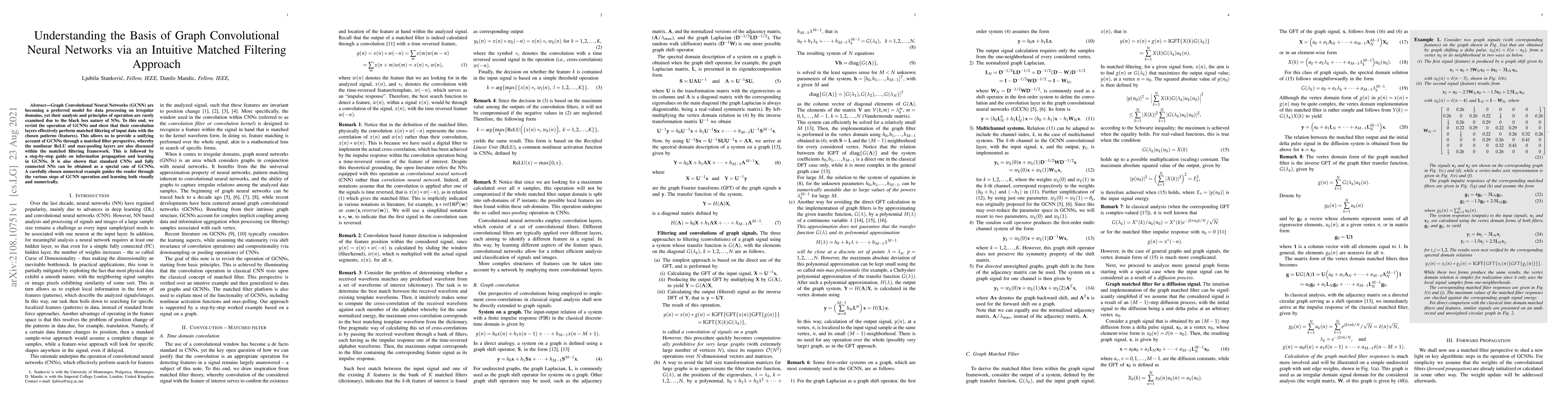 This paper explores Graph Convolutional Neural Networks (GCNN) by framing their convolution layers as matched filtering processes, providing a clear, intuitive understanding of their operation. It also demonstrates how GCNNs encompass standard CNNs and fully connected NNs as special cases, and includes a numerical example to illustrate the learning process.