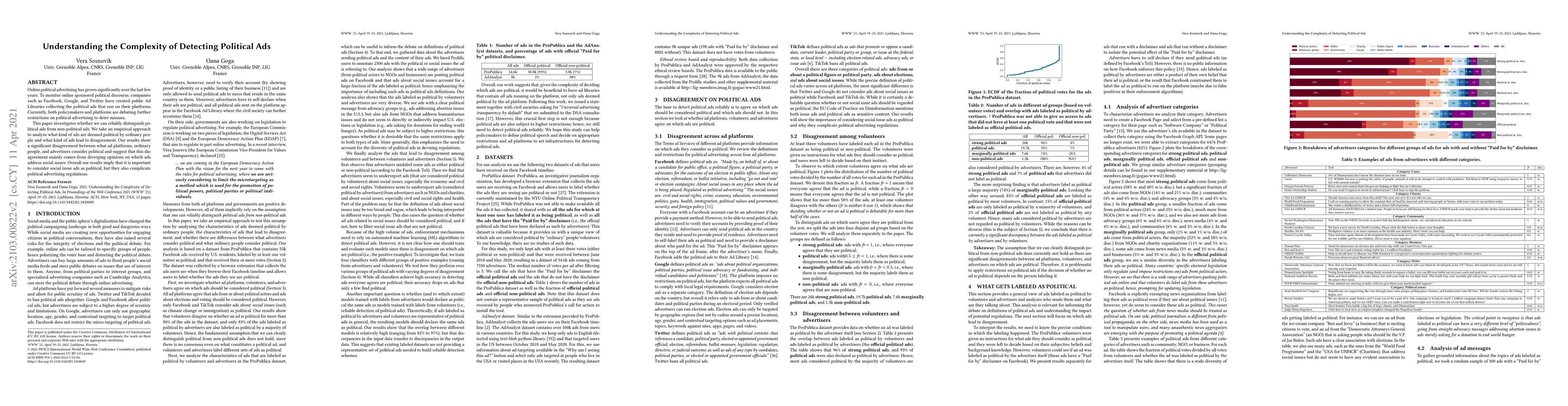 Online political advertising has grown significantly over the last few years. To monitor online sponsored political discourse, companies such as Facebook, Google, and Twitter have created public Ad Libraries collecting the political ads that run on their platforms. Currently, both policymakers and platforms are debating further restrictions on political advertising to deter misuses. This paper investigates whether we can reliably distinguish political ads from non-political ads. We take an empirical approach to analyze what kind of ads are deemed political by ordinary people and what kind of ads lead to disagreement. Our results show a significant disagreement between what ad platforms, ordinary people, and advertisers consider political and suggest that this disagreement mainly comes from diverging opinions on which ads address social issues. Overall our results imply that it is important to consider social issue ads as political, but they also complicate political advertising regulations.