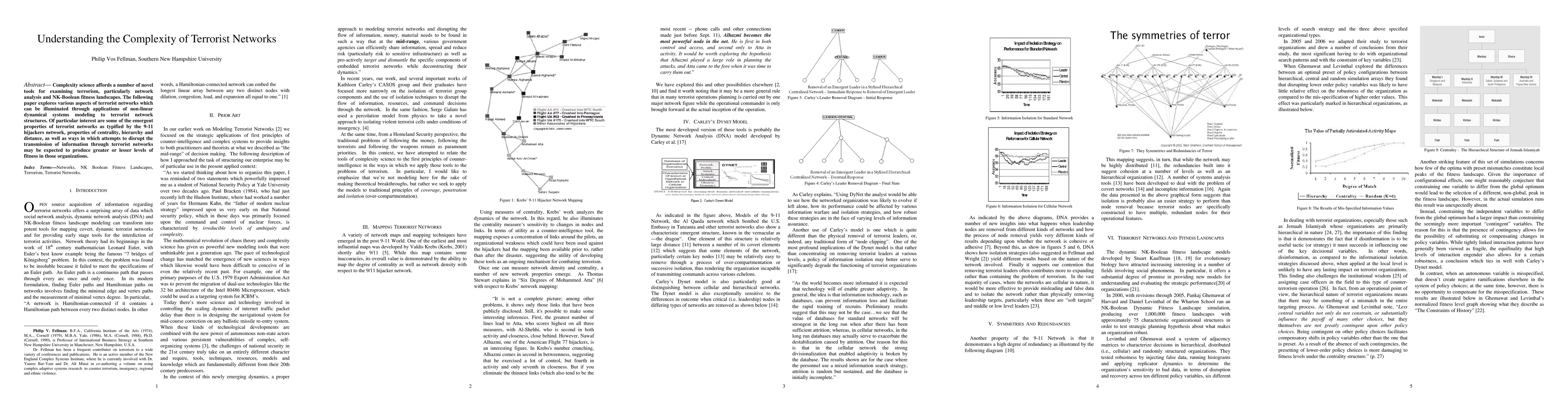 This paper utilizes complexity science, particularly network analysis and NK-Boolean fitness landscapes, to explore the emergent properties of terrorist networks, focusing on centrality, hierarchy, and information transmission disruption. The study highlights the non-linear dynamics of terrorist organizations exemplified by the 9-11 hijackers network.