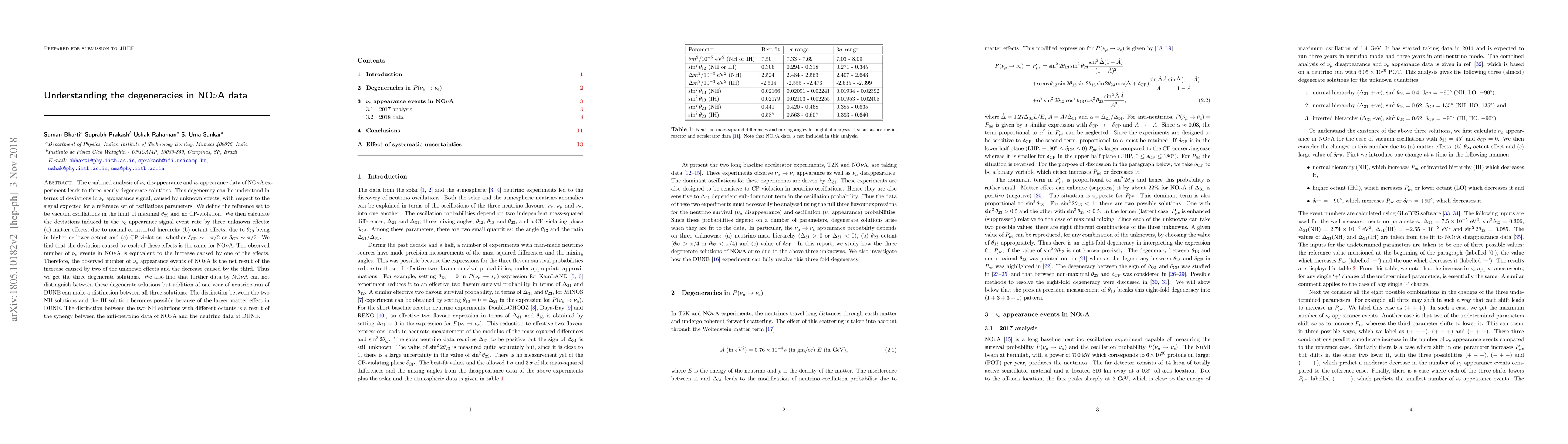 The combined analysis of $\nu_\mu$ disappearance and $\nu_e$ appearance data of NO$\nu$A experiment leads to three nearly degenerate solutions. This degeneracy can be understood in terms of deviations in $\nu_e$ appearance signal, caused by unknown effects, with respect to the signal expected for a reference set of oscillations parameters. We define the reference set to be vacuum oscillations in the limit of maximal $\theta_{23}$ and no CP-violation. We then calculate the deviations induced in the $\nu_e$ appearance signal event rate by three unknown effects: (a) matter effects, due to normal or inverted hierarchy (b) octant effects, due to $\theta_{23}$ being in higher or lower octant and (c) CP-violation, whether $\delta_{CP} \sim - \pi/2$ or $\delta_{CP} \sim \pi/2$. We find that the deviation caused by each of these effects is the same for NO$\nu$A. The observed number of $\nu_e$ events in NO$\nu$A is equivalent to the increase caused by one of the effects. Therefore, the observed number of $\nu_e$ appearance events of NO$\nu$A is the net result of the increase caused by two of the unknown effects and the decrease caused by the third. Thus we get the three degenerate solutions. We also find that further data by NO$\nu$A can not distinguish between these degenerate solutions but addition of one year of neutrino run of DUNE can make a distinction between all three solutions. The distinction between the two NH solutions and the IH solution becomes possible because of the larger matter effect in DUNE. The distinction between the two NH solutions with different octants is a result of the synergy between the anti-neutrino data of NO$\nu$A and the neutrino data of DUNE.