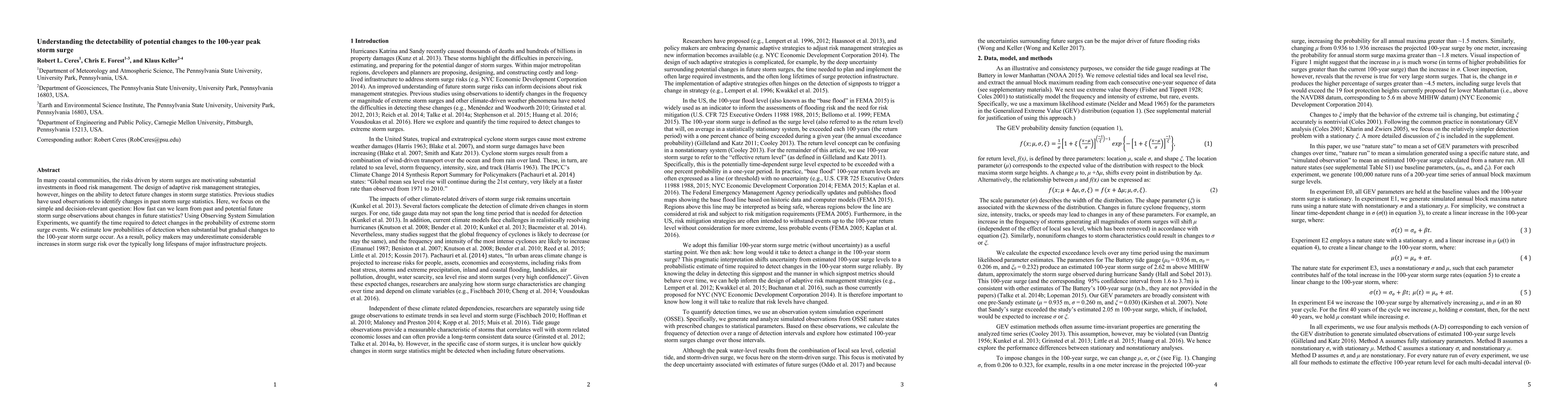 This study investigates the detectability of gradual changes to the 100-year peak storm surge using Observing System Simulation Experiments. It finds low probabilities of detecting such changes, suggesting potential underestimation of increased storm surge risks by policymakers over long-term infrastructure project lifespans.