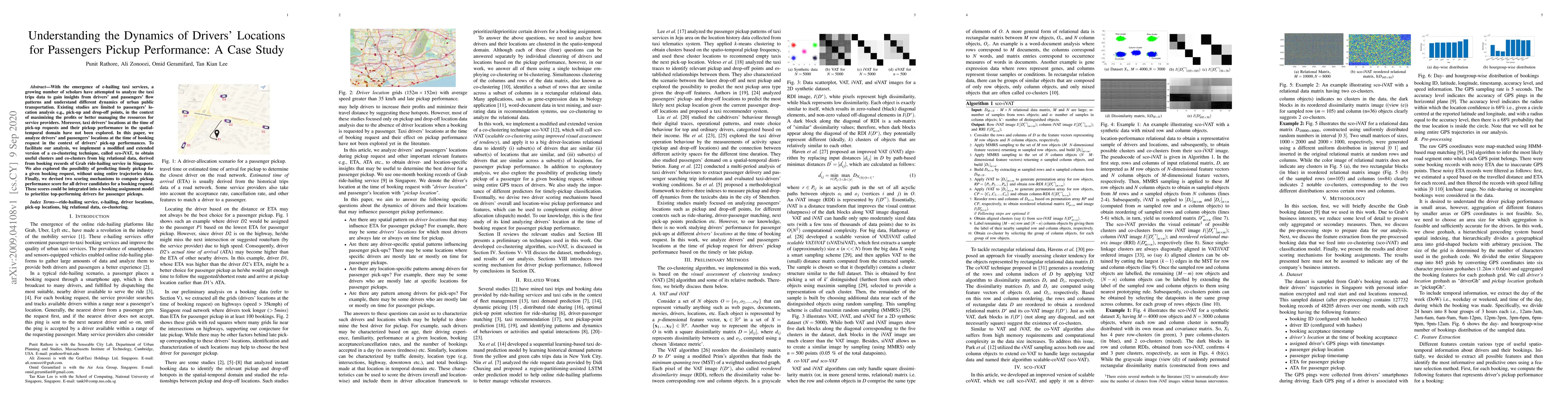 With the emergence of e-hailing taxi services, a growing number of scholars have attempted to analyze the taxi trips data to gain insights from drivers' and passengers' flow patterns and understand different dynamics of urban public transportation. Existing studies are limited to passengers' location analysis e.g., pick-up and drop-off points, in the context of maximizing the profits or better managing the resources for service providers. Moreover, taxi drivers' locations at the time of pick-up requests and their pickup performance in the spatial-temporal domain have not been explored. In this paper, we analyze drivers' and passengers' locations at the time of booking request in the context of drivers' pick-up performances. To facilitate our analysis, we implement a modified and extended version of a co-clustering technique, called sco-iVAT, to obtain useful clusters and co-clusters from big relational data, derived from booking records of Grab ride-hailing service in Singapore. We also explored the possibility of predicting timely pickup for a given booking request, without using entire trajectories data. Finally, we devised two scoring mechanisms to compute pickup performance score for all driver candidates for a booking request. These scores could be integrated into a booking assignment model to prioritize top-performing drivers for passenger pickups.