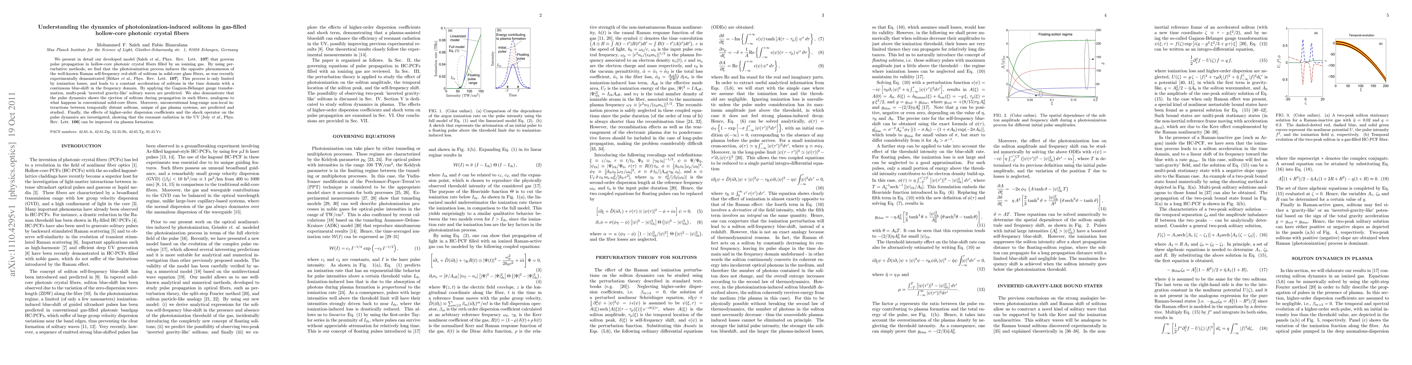 We present in detail our developed model [Saleh et al., Phys. Rev. Lett. 107] that governs pulse propagation in hollow-core photonic crystal fibers filled by an ionizing gas. By using perturbative methods, we find that the photoionization process induces the opposite phenomenon of the well-known Raman self-frequency red-shift of solitons in solid-core glass fibers, as was recently experimentally demonstrated [Hoelzer et al., Phys. Rev. Lett. 107]. This process is only limited by ionization losses, and leads to a constant acceleration of solitons in the time domain with a continuous blue-shift in the frequency domain. By applying the Gagnon-B\'{e}langer gauge transformation, multi-peak `inverted gravity-like' solitary waves are predicted. We also demonstrate that the pulse dynamics shows the ejection of solitons during propagation in such fibers, analogous to what happens in conventional solid-core fibers. Moreover, unconventional long-range non-local interactions between temporally distant solitons, unique of gas plasma systems, are predicted and studied. Finally, the effects of higher-order dispersion coefficients and the shock operator on the pulse dynamics are investigated, showing that the resonant radiation in the UV [Joly et al., Phys. Rev. Lett. 106] can be improved via plasma formation.