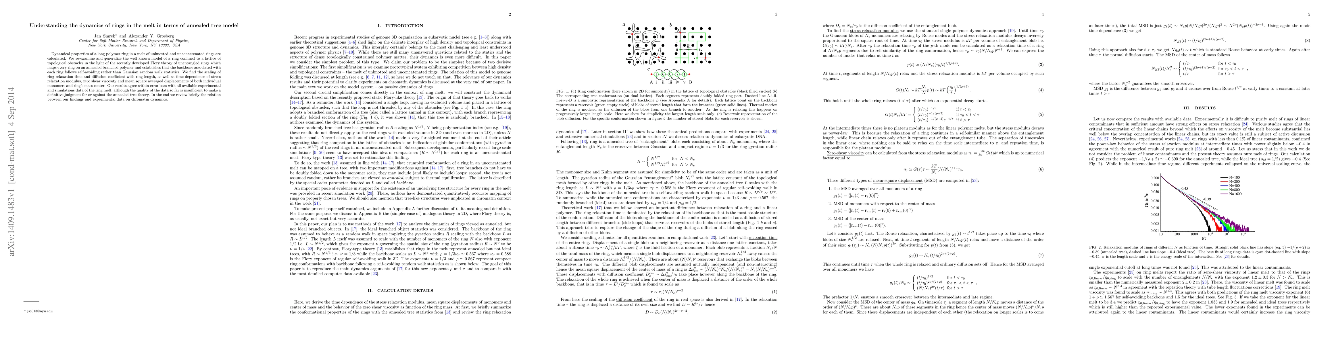 This paper examines the dynamics of polymer rings in a melt using an annealed tree model, finding scaling laws for relaxation time, diffusion, and stress relaxation that align with experimental data, though the quality of existing data is insufficient to definitively support the annealed tree theory. The study also relates the findings to chromatin dynamics.