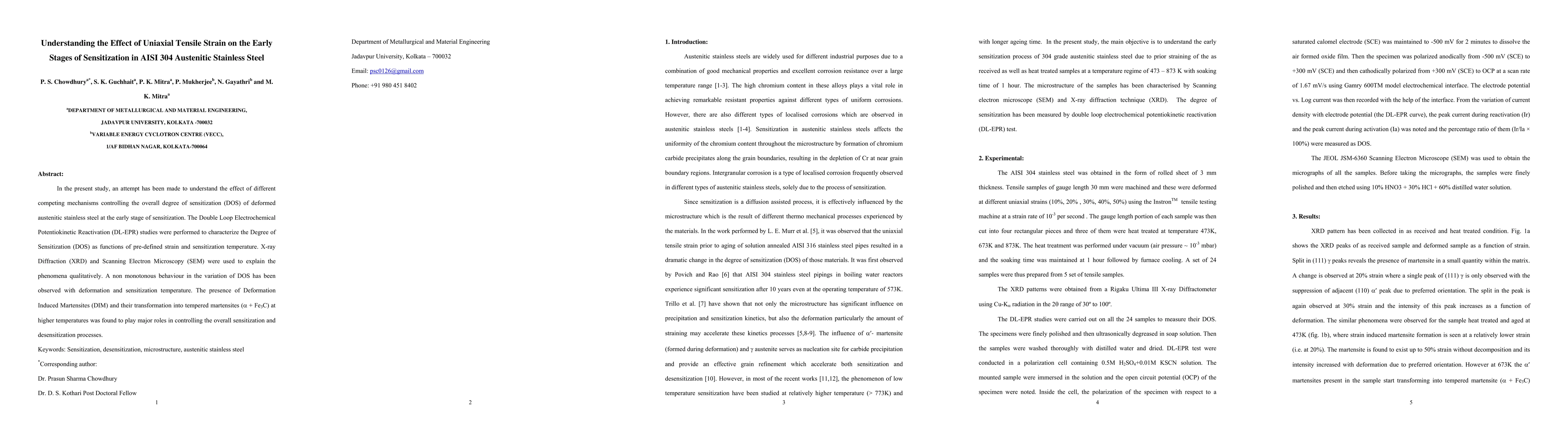 This study investigates how uniaxial tensile strain influences the early stages of sensitization in AISI 304 stainless steel using DL-EPR, XRD, and SEM. Findings reveal a non-monotonic DOS variation linked to deformation and temperature, with deformation-induced martensites significantly affecting sensitization and desensitization processes.