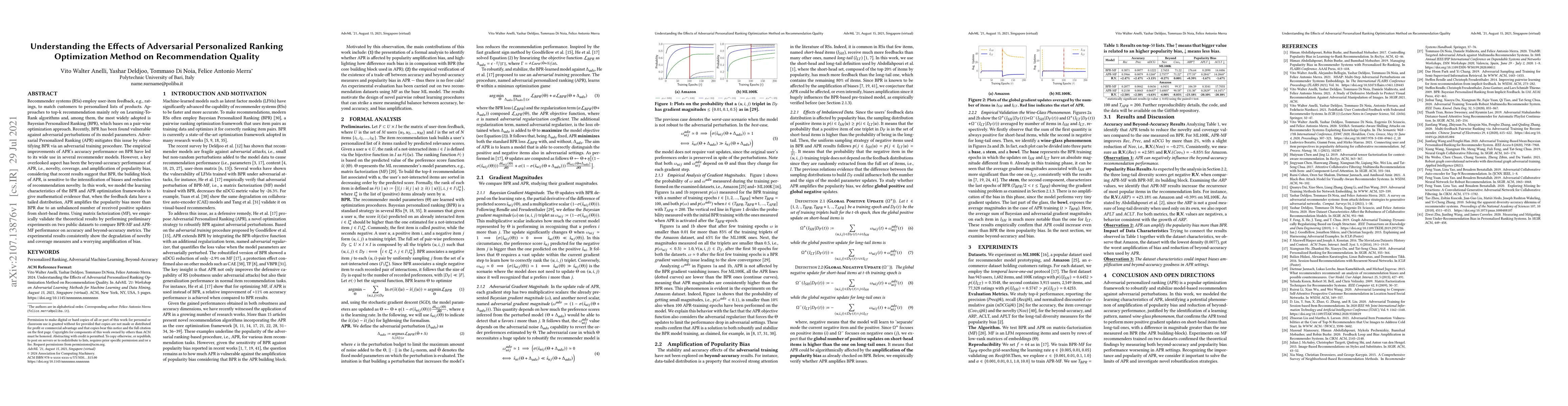 This paper investigates the effects of Adversarial Personalized Ranking (APR) on recommendation quality beyond accuracy, finding that APR amplifies popularity bias and degrades novelty and coverage compared to Bayesian Personalized Ranking (BPR). Theoretical modeling and empirical experiments using matrix factorization on public datasets confirm these findings.
