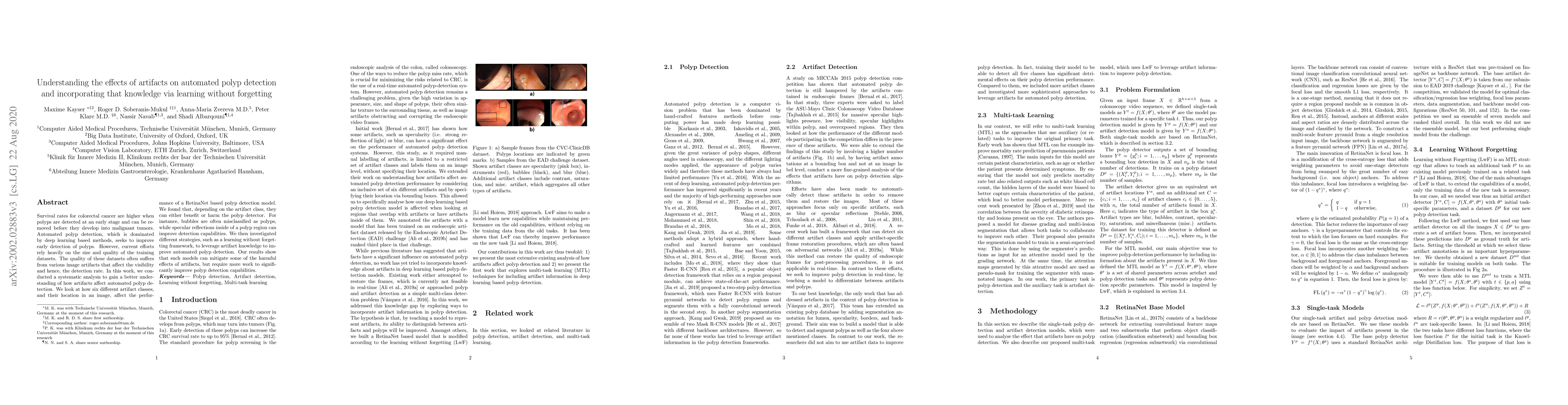 This paper investigates the impact of various image artifacts on automated polyp detection using deep learning, finding that artifacts can either hinder or aid detection. It proposes a learning without forgetting approach to mitigate the harmful effects of artifacts, showing potential for improved polyp detection.