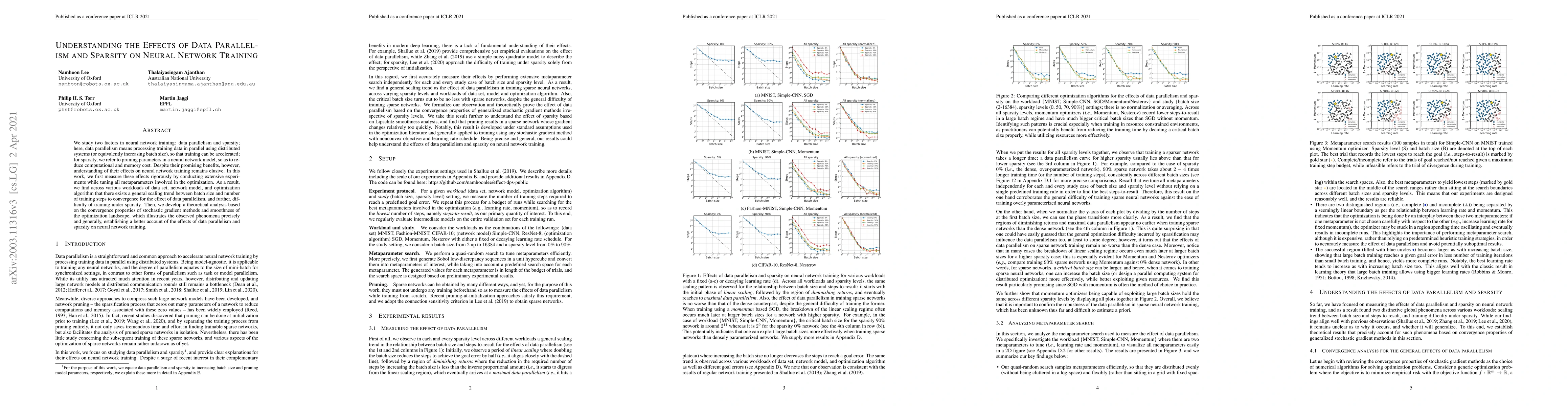 This paper investigates the effects of data parallelism and sparsity on neural network training through rigorous experiments and theoretical analysis. It finds a scaling trend between batch size and training steps for data parallelism, and highlights the challenges of training under sparsity, supported by a theoretical framework explaining these observations.