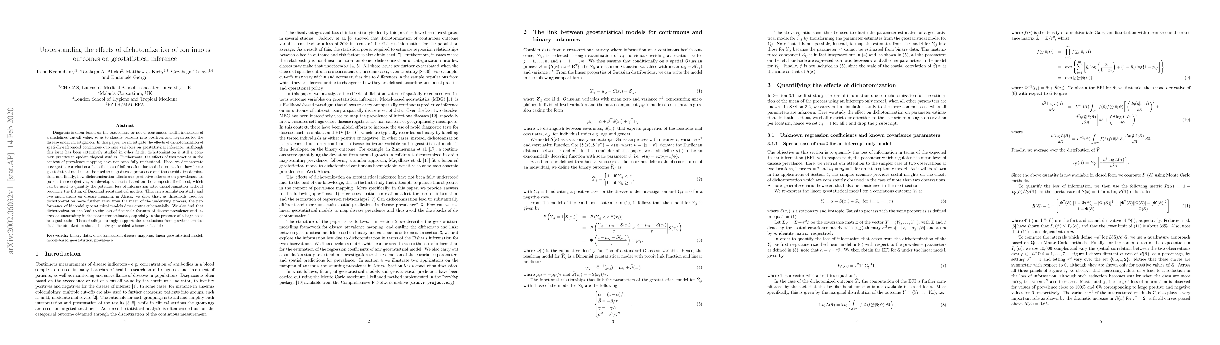 This paper explores the impact of dichotomizing continuous health indicators for geostatistical inference, demonstrating that it leads to information loss and increases uncertainty in prevalence mapping. The study proposes a metric based on composite likelihood to quantify this loss and shows that dichotomization can obscure fine-scale disease patterns, especially when noise levels are high.