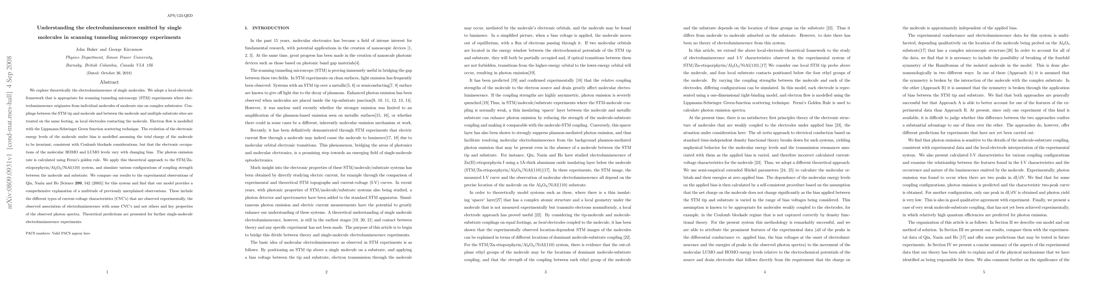 This paper theoretically investigates the electroluminescence from single molecules in scanning tunneling microscopy (STM) experiments, modeling electron flow and photon emission to explain diverse experimental observations, including current-voltage characteristics and photon spectra, and compares results with experimental data from a Zn-etioporphyrin system.
