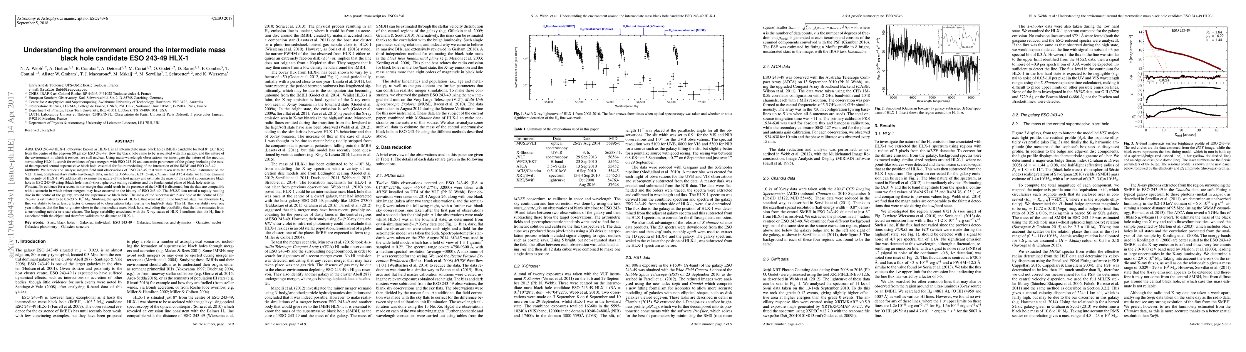 Aims. ESO 243-49 HLX-1, otherwise known as HLX-1, is an intermediate mass black hole (IMBH) candidate located 8" (3.7 Kpc) from the centre of the edge-on S0 galaxy ESO 243-49. How the black hole came to be associated with this galaxy, and the nature of the environment in which it resides, are still unclear. Using multi-wavelength observations we investigate the nature of the medium surrounding HLX-1, search for evidence of past mergers with ESO 243-49 and constrain parameters of the galaxy. Methods. We reduce and analyse integral field unit observations of ESO 243-49 that were taken with the MUSE instrument on the VLT. Using complementary multi-wavelength data, including X-Shooter, HST, Swift, Chandra and ATCA data, we further examine the vicinity of HLX-1. We additionally examine the nature of the host galaxy and estimate the mass of the central supermassive black hole (SMBH) in ESO 243-49. Results. No evidence for a recent minor-merger that could result in the presence of the IMBH is discerned, but the data are compatible with a scenario in which minor mergers may have occurred in the history of ESO 243-49. The MUSE data reveal a rapidly rotating disc in the centre of the galaxy, around the SMBH. The mass of the SMBH at the centre of ESO 243-49 is estimated to be 0.5-23 $\times$ 10$^7$ M$_\odot$. Studying the spectra of HLX-1, that were taken in the low/hard state, we determine H$_\alpha$ flux variability to be at least a factor 6, compared to observations taken during the high/soft state. This H$_\alpha$ flux variability over one year indicates that the line originates close to the IMBH, excluding the possibility that the line emanates from a surrounding nebula or a star cluster. The large variability associated with the X-ray states of HLX-1 confirms that the H$_\alpha$ line is associated with the object and therefore validates the distance to HLX-1.