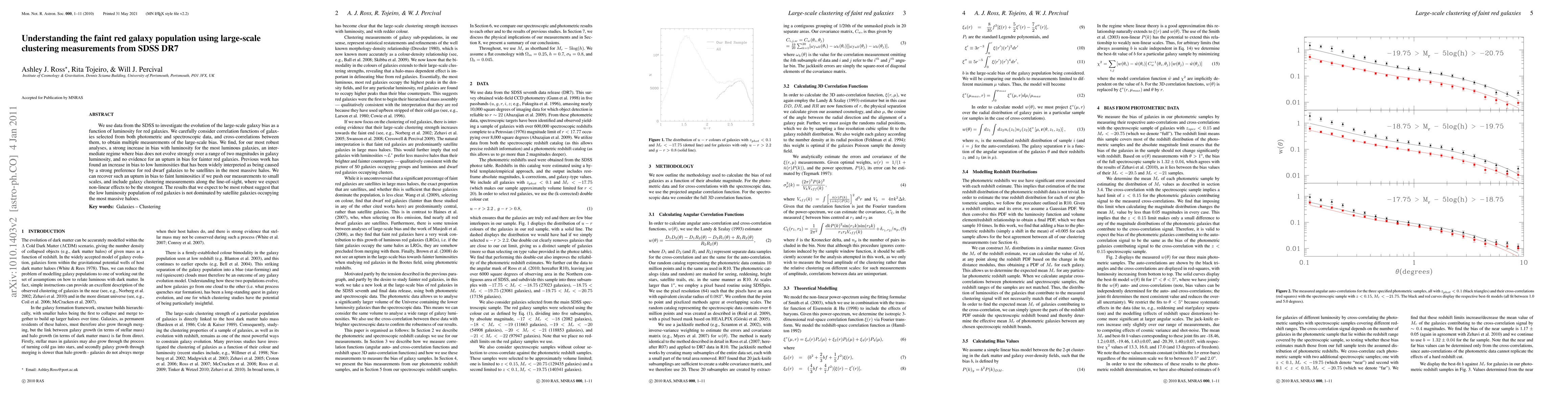 This study uses SDSS DR7 data to analyze the large-scale clustering and galaxy bias evolution of red galaxies, finding a strong increase in bias with luminosity for the most luminous galaxies and no significant upturn for fainter ones. The results suggest that faint red galaxies are not predominantly satellite galaxies in massive halos.