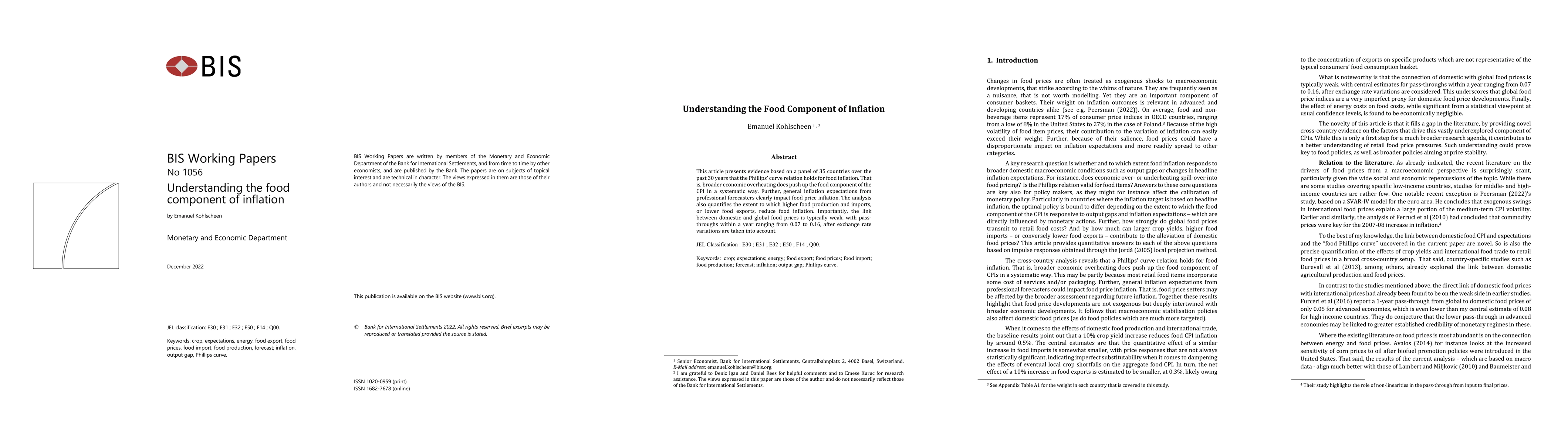 This article presents evidence based on a panel of 35 countries over the past 30 years that the Phillips curve relation holds for food inflation. That is, broader economic overheating does push up the food component of the CPI in a systematic way. Further, general inflation expectations from professional forecasters clearly impact food price inflation. The analysis also quantifies the extent to which higher food production and imports, or lower food exports, reduce food inflation. Importantly, the link between domestic and global food prices is typically weak, with passthroughs within a year ranging from 0.07 to 0.16, after exchange rate variations are taken into account.