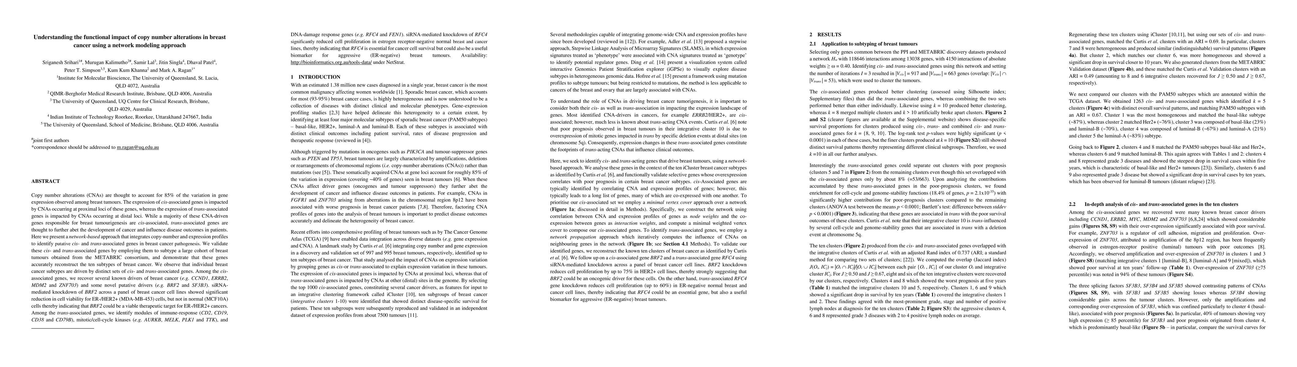 This study employs a network modeling approach to understand how copy number alterations (CNAs) impact gene expression in breast cancer, distinguishing between cis- and trans-associated genes. The research identifies specific genes driving different breast cancer subtypes and validates these findings by reconstructing the ten subtypes of breast cancer, suggesting potential novel therapeutic targets like BRF2 in HER2+ lines.