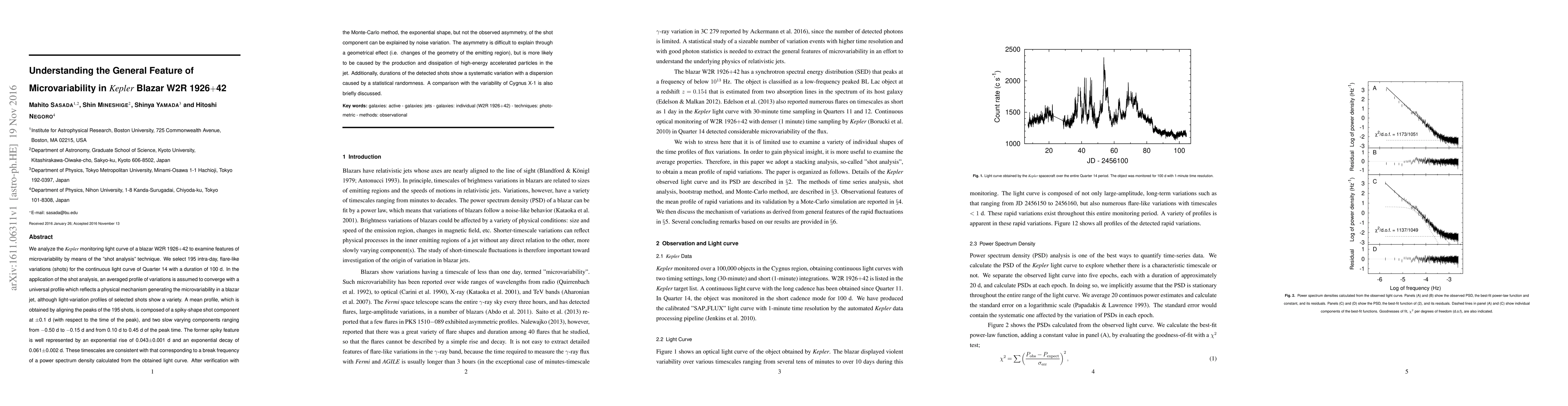 We analyze the ${\it Kepler}$ monitoring light curve of a blazar W2R 1926$+$42 to examine features of microvariability by means of the "shot analysis" technique. We select 195 intra-day, flare-like variations (shots) for the continuous light curve of Quarter 14 with a duration of 100 d. In the application of the shot analysis, an averaged profile of variations is assumed to converge with a universal profile which reflects a physical mechanism generating the microvariability in a blazar jet, although light-variation profiles of selected shots show a variety. A mean profile, which is obtained by aligning the peaks of the 195 shots, is composed of a spiky-shape shot component at $\pm$0.1 d (with respect to the time of the peak), and two slow varying components ranging from $-$0.50 d to $-$0.15 d and from 0.10 d to 0.45 d of the peak time. The former spiky feature is well represented by an exponential rise of 0.043$\pm$0.001 d and an exponential decay of 0.061$\pm$0.002 d. These timescales are consistent with that corresponding to a break frequency of a power spectrum density calculated from the obtained light curve. After verification with the Monte-Carlo method, the exponential shape, but not the observed asymmetry, of the shot component can be explained by noise variation. The asymmetry is difficult to explain through a geometrical effect (i.e. changes of the geometry of the emitting region), but is more likely to be caused by the production and dissipation of high-energy accelerated particles in the jet. Additionally, durations of the detected shots show a systematic variation with a dispersion caused by a statistical randomness. A comparison with the variability of Cygnus X-1 is also briefly discussed.