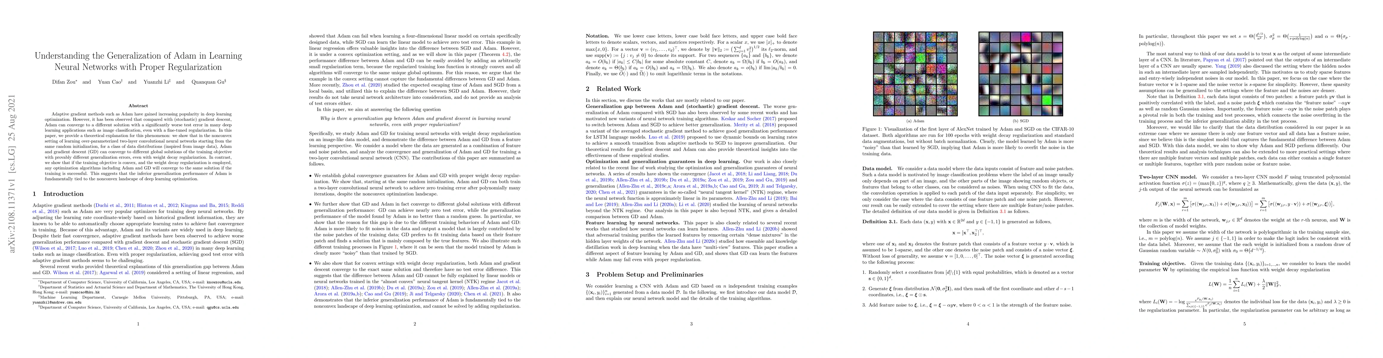 Adaptive gradient methods such as Adam have gained increasing popularity in deep learning optimization. However, it has been observed that compared with (stochastic) gradient descent, Adam can converge to a different solution with a significantly worse test error in many deep learning applications such as image classification, even with a fine-tuned regularization. In this paper, we provide a theoretical explanation for this phenomenon: we show that in the nonconvex setting of learning over-parameterized two-layer convolutional neural networks starting from the same random initialization, for a class of data distributions (inspired from image data), Adam and gradient descent (GD) can converge to different global solutions of the training objective with provably different generalization errors, even with weight decay regularization. In contrast, we show that if the training objective is convex, and the weight decay regularization is employed, any optimization algorithms including Adam and GD will converge to the same solution if the training is successful. This suggests that the inferior generalization performance of Adam is fundamentally tied to the nonconvex landscape of deep learning optimization.