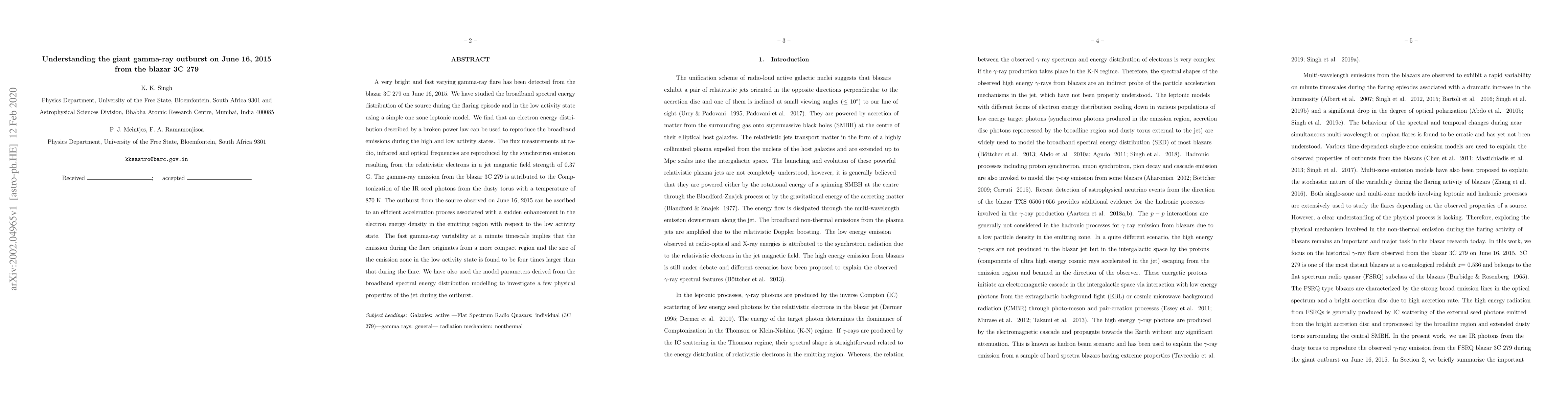 This paper analyzes the giant gamma-ray outburst from blazar 3C 279 on June 16, 2015, using a one-zone leptonic model. The study finds that a broken power law electron distribution and synchrotron emission can reproduce the observed broadband spectrum, attributing the gamma-ray emission to Comptonized infrared photons. The flare's compactness suggests a more confined emission region compared to the low activity state.