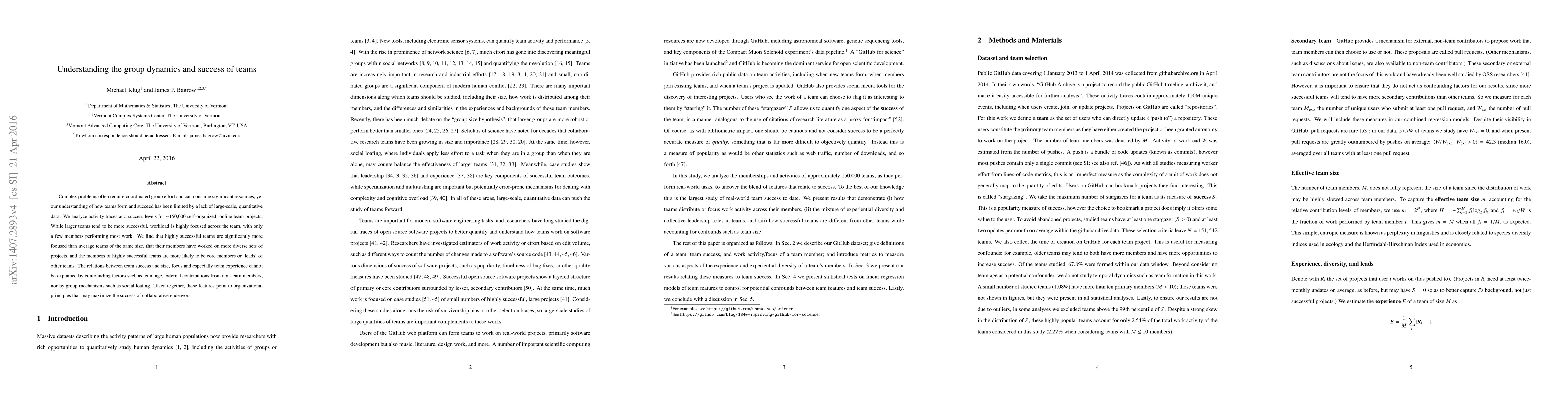 Complex problems often require coordinated group effort and can consume significant resources, yet our understanding of how teams form and succeed has been limited by a lack of large-scale, quantitative data. We analyze activity traces and success levels for ~150,000 self-organized, online team projects. While larger teams tend to be more successful, workload is highly focused across the team, with only a few members performing most work. We find that highly successful teams are significantly more focused than average teams of the same size, that their members have worked on more diverse sets of projects, and the members of highly successful teams are more likely to be core members or 'leads' of other teams. The relations between team success and size, focus and especially team experience cannot be explained by confounding factors such as team age, external contributions from non-team members, nor by group mechanisms such as social loafing. Taken together, these features point to organizational principles that may maximize the success of collaborative endeavors.