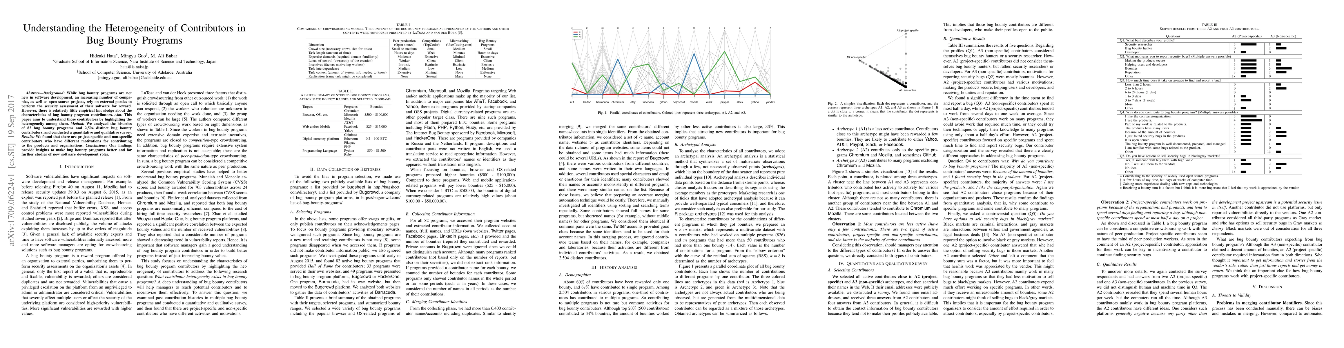 Background: While bug bounty programs are not new in software development, an increasing number of companies, as well as open source projects, rely on external parties to perform the security assessment of their software for reward. However, there is relatively little empirical knowledge about the characteristics of bug bounty program contributors. Aim: This paper aims to understand those contributors by highlighting the heterogeneity among them. Method: We analyzed the histories of 82 bug bounty programs and 2,504 distinct bug bounty contributors, and conducted a quantitative and qualitative survey. Results: We found that there are project-specific and non-specific contributors who have different motivations for contributing to the products and organizations. Conclusions: Our findings provide insights to make bug bounty programs better and for further studies of new software development roles.