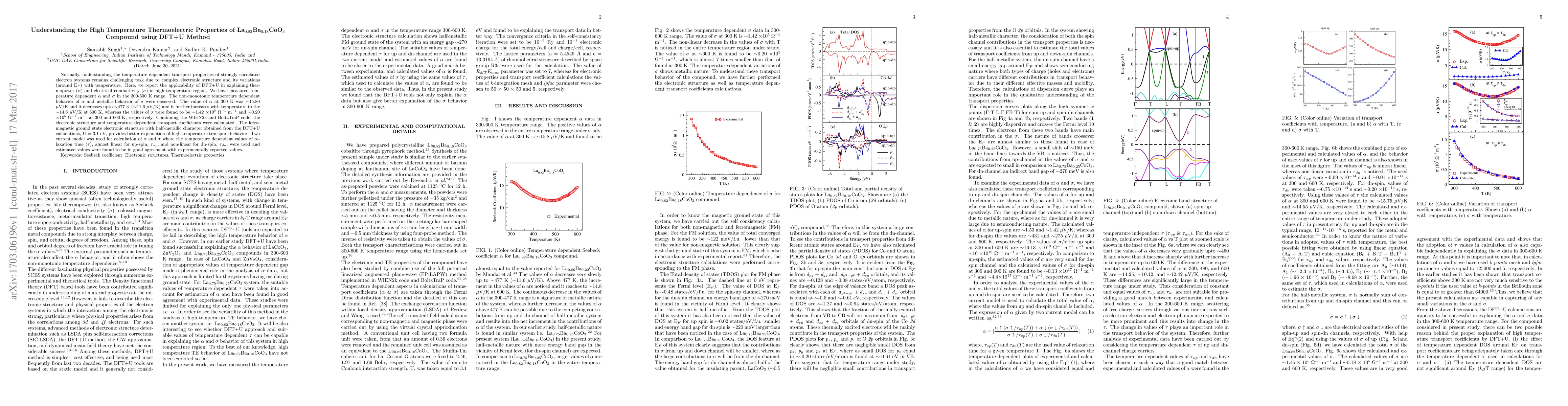 Normally, understanding the temperature dependent transport properties of strongly correlated electron systems remains challenging task due to complex electronic structure and its variations (around E$_{F}$) with temperature. Here, we report the applicability of DFT+U in explaining thermopower ($\alpha$) and electrical conductivity ($\sigma$) in high temperature region. We have measured temperature dependent $\alpha$ and $\sigma$ in the 300-600 K range. The non-monotonic temperature dependent behavior of $\alpha$ and metallic behavior of $\sigma$ were observed. The value of $\alpha$ at 300 K was $\sim$15.80 $\mu$V/K and it decreases upto $\sim$477 K ($\sim$11.6 $\mu$V/K) and it further increases with temperature to the $\sim$14.8 $\mu$V/K at 600 K, whereas the values of $\sigma$ were found to be $\sim$1.42 $\times$10$^{5}$ $\Omega$$^{-1}$ m$^{-1}$ and $\sim$0.20 $\times$10$^{5}$ $\Omega$$^{-1}$ m$^{-1}$ at 300 and 600 K, respectively. Combining the WIEN2k and BoltzTraP code, the electronic structure and temperature dependent transport coefficients were calculated. The ferromagnetic ground state electronic structure with half-metallic character obtained from the DFT+U calculations, U = 3.1 eV, provides better explanation of high-temperature transport behavior. Two current model was used for calculation of $\alpha$ and $\sigma$ where the temperature dependent values of relaxation time ($\tau$), almost linear for up-spin, $\tau$$_{up}$, and non-linear for dn-spin, $\tau$$_{dn}$, were used and estimated values were found to be in good agreement with experimentally reported values.