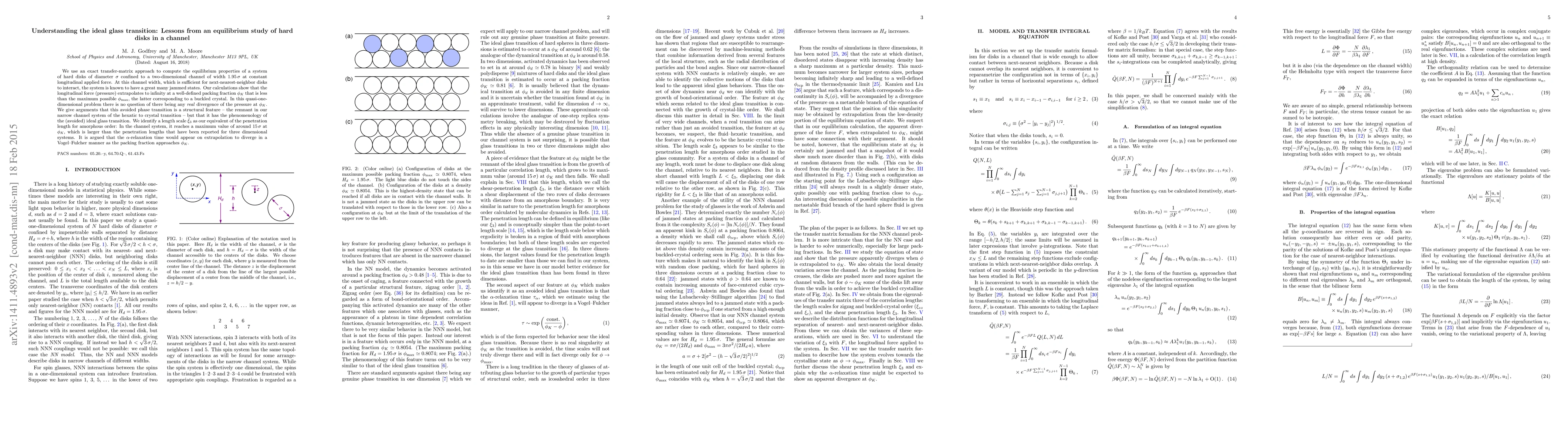 We use an exact transfer-matrix approach to compute the equilibrium properties of a system of hard disks of diameter $\sigma$ confined to a two-dimensional channel of width $1.95\,\sigma$ at constant longitudinal applied force. At this channel width, which is sufficient for next-nearest-neighbor disks to interact, the system is known to have a great many jammed states. Our calculations show that the longitudinal force (pressure) extrapolates to infinity at a well-defined packing fraction $\phi_K$ that is less than the maximum possible $\phi_{\rm max}$, the latter corresponding to a buckled crystal. In this quasi-one-dimensional problem there is no question of there being any \emph{real} divergence of the pressure at $\phi_K$. We give arguments that this avoided phase transition is a structural feature -- the remnant in our narrow channel system of the hexatic to crystal transition -- but that it has the phenomenology of the (avoided) ideal glass transition. We identify a length scale $\tilde{\xi}_3$ as our equivalent of the penetration length for amorphous order: In the channel system, it reaches a maximum value of around $15\,\sigma$ at $\phi_K$, which is larger than the penetration lengths that have been reported for three dimensional systems. It is argued that the $\alpha$-relaxation time would appear on extrapolation to diverge in a Vogel-Fulcher manner as the packing fraction approaches $\phi_K$.