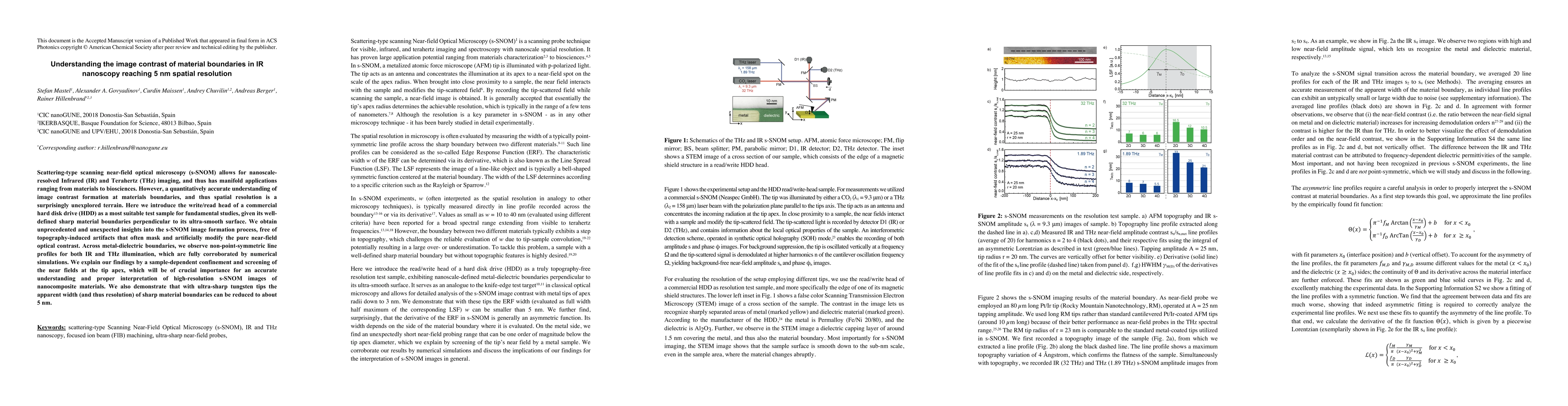 This research uses a hard disk drive's write/read head as a test sample to gain unprecedented insights into image contrast formation in scattering-type scanning near-field optical microscopy (s-SNOM). Findings reveal non-point-symmetric line profiles at metal-dielectric boundaries, explained by near-field confinement and screening at the tip apex. The study demonstrates achieving approximately 5 nm spatial resolution with ultra-sharp tungsten tips, crucial for interpreting high-resolution s-SNOM images of nanocomposite materials.
