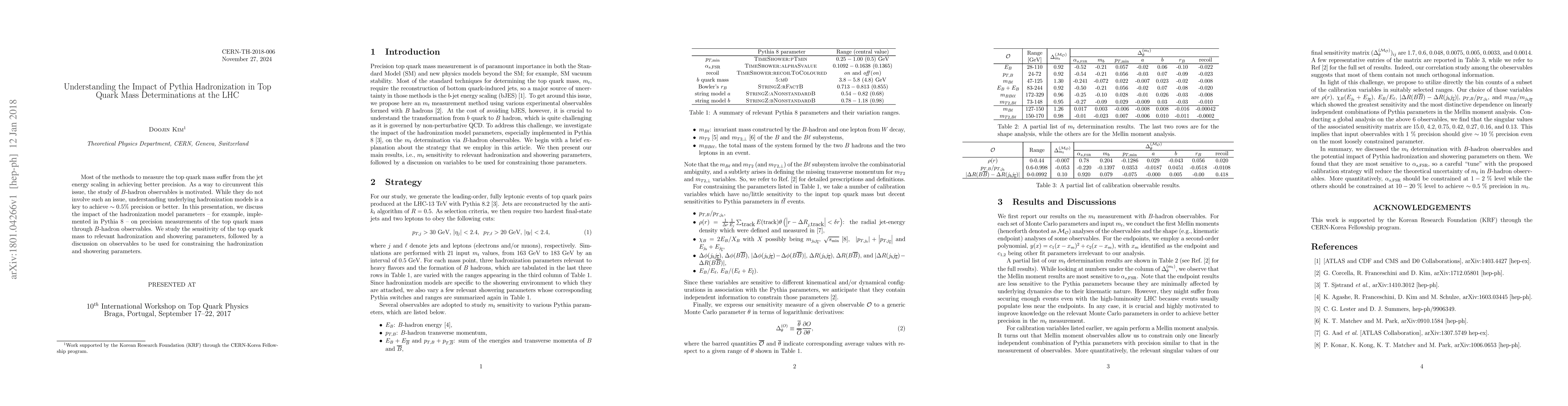 Most of the methods to measure the top quark mass suffer from the jet energy scaling in achieving better precision. As a way to circumvent this issue, the study of $B$-hadron observables is motivated. While they do not involve such an issue, understanding underlying hadronization models is a key to achieve $\sim 0.5\%$ precision or better. In this presentation, we discuss the impact of the hadronization model parameters - for example, implemented in Pythia 8 - on precision measurements of the top quark mass through $B$-hadron observables. We study the sensitivity of the top quark mass to relevant hadronization and showering parameters, followed by a discussion on observables to be used for constraining the hadronization and showering parameters.