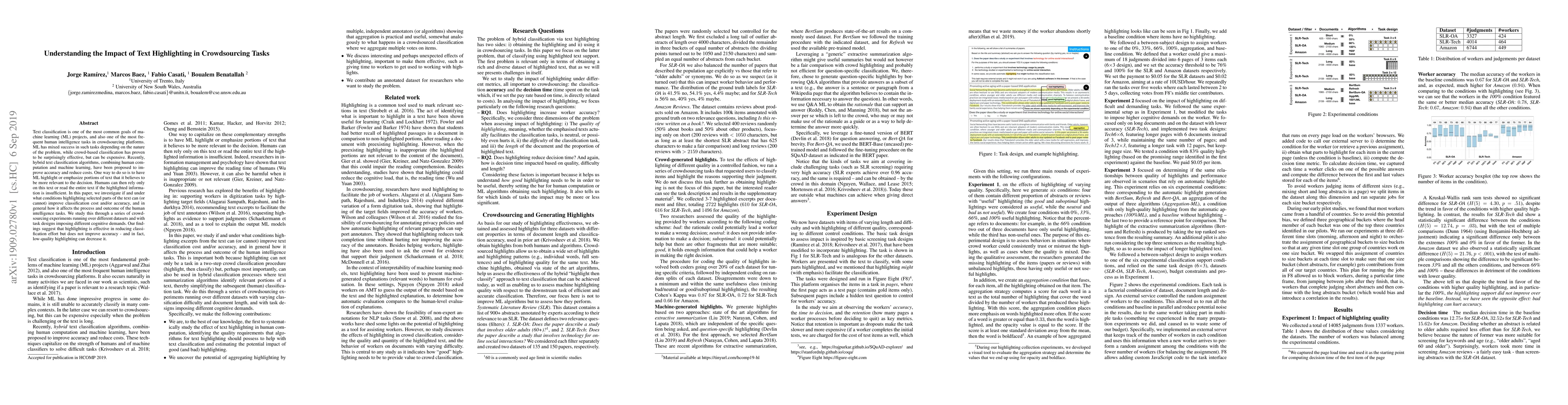 This paper explores how text highlighting by machine learning algorithms can improve the efficiency of crowdsourcing text classification tasks, finding that while it reduces effort, it does not enhance accuracy, and may even lower it if the highlighting is poor. Experiments across various datasets and cognitive demands support these conclusions.