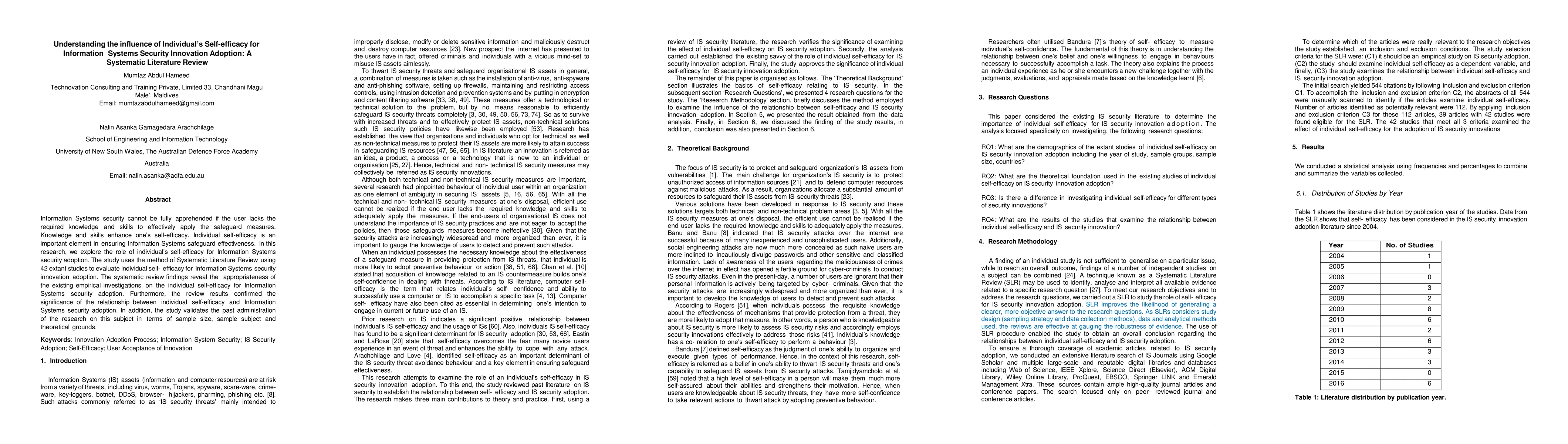 Information Systems security cannot be fully apprehended if the user lacks the required knowledge and skills to effectively apply the safeguard measures. Knowledge and skills enhance one's self-efficacy. Individual self-efficacy is an important element in ensuring Information Systems safeguard effectiveness. In this research, we explore the role of individual's self-efficacy for Information Systems security adoption. The study uses the method of Systematic Literature Review using 42 extant studies to evaluate individual self- efficacy for Information Systems security innovation adoption. The systematic review findings reveal the appropriateness of the existing empirical investigations on the individual self-efficacy for Information Systems security adoption. Furthermore, the review results confirmed the significance of the relationship between individual self-efficacy and Information Systems security adoption. In addition, the study validates the past administration of the research on this subject in terms of sample size, sample subject and theoretical grounds.