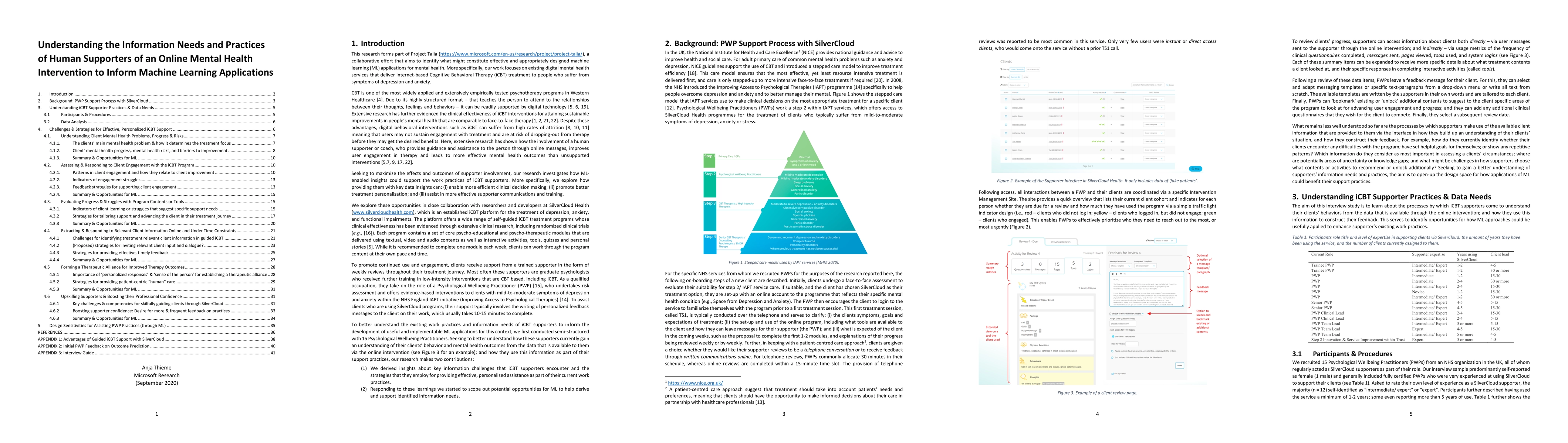 In the context of digital therapy interventions, such as internet-delivered Cognitive Behavioral Therapy (iCBT) for the treatment of depression and anxiety, extensive research has shown how the involvement of a human supporter or coach, who assists the person undergoing treatment, improves user engagement in therapy and leads to more effective health outcomes than unsupported interventions. Seeking to maximize the effects and outcomes of this human support, the research investigates how new opportunities provided through recent advances in the field of AI and machine learning (ML) can contribute useful data insights to effectively support the work practices of iCBT supporters. This paper reports detailed findings of an interview study with 15 iCBT supporters that deepens understanding of their existing work practices and information needs with the aim to meaningfully inform the development of useful, implementable ML applications particularly in the context of iCBT treatment for depression and anxiety. The analysis contributes (1) a set of six themes that summarize the strategies and challenges that iCBT supporters encounter in providing effective, personalized feedback to their mental health clients; and in response to these learnings, (2) presents for each theme concrete opportunities for how methods of ML could help support and address identified challenges and information needs. It closes with reflections on potential social, emotional and pragmatic implications of introducing new machine-generated data insights within supporter-led client review practices.