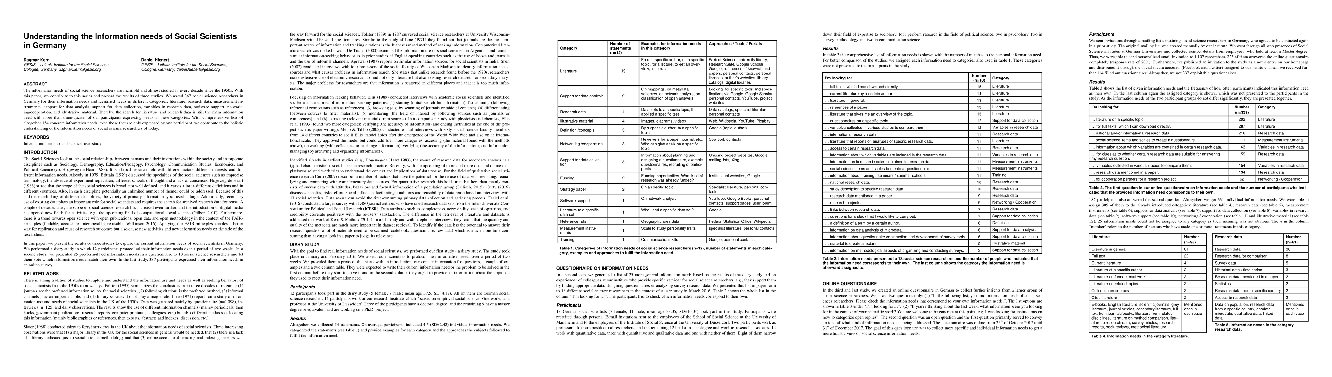 This study surveys 367 German social science researchers to identify their diverse information needs, categorizing them into literature, data, instruments, and support services. Despite a wide range of needs, literature and research data remain the primary focus for over three-quarters of respondents.